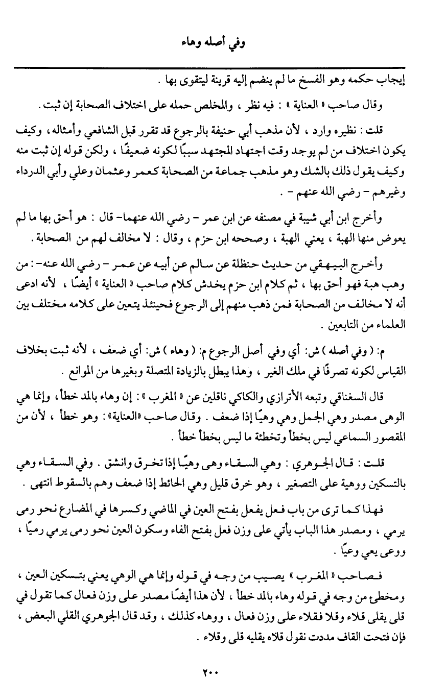 قال السغناقي وتبعه الأترازي والكاكي ناقلين عن " المغرب ": إن وهاء بالمد خطأ وإنما هي الوهي مصدر وهى الجمل وهى وهيا إذا ضعف. وقال صاحب " العناية ": وهو خطأ؛ لأن من المقصور السماعي ليس بخطأ وتخطئة ما ليس بخطأ خطأ.