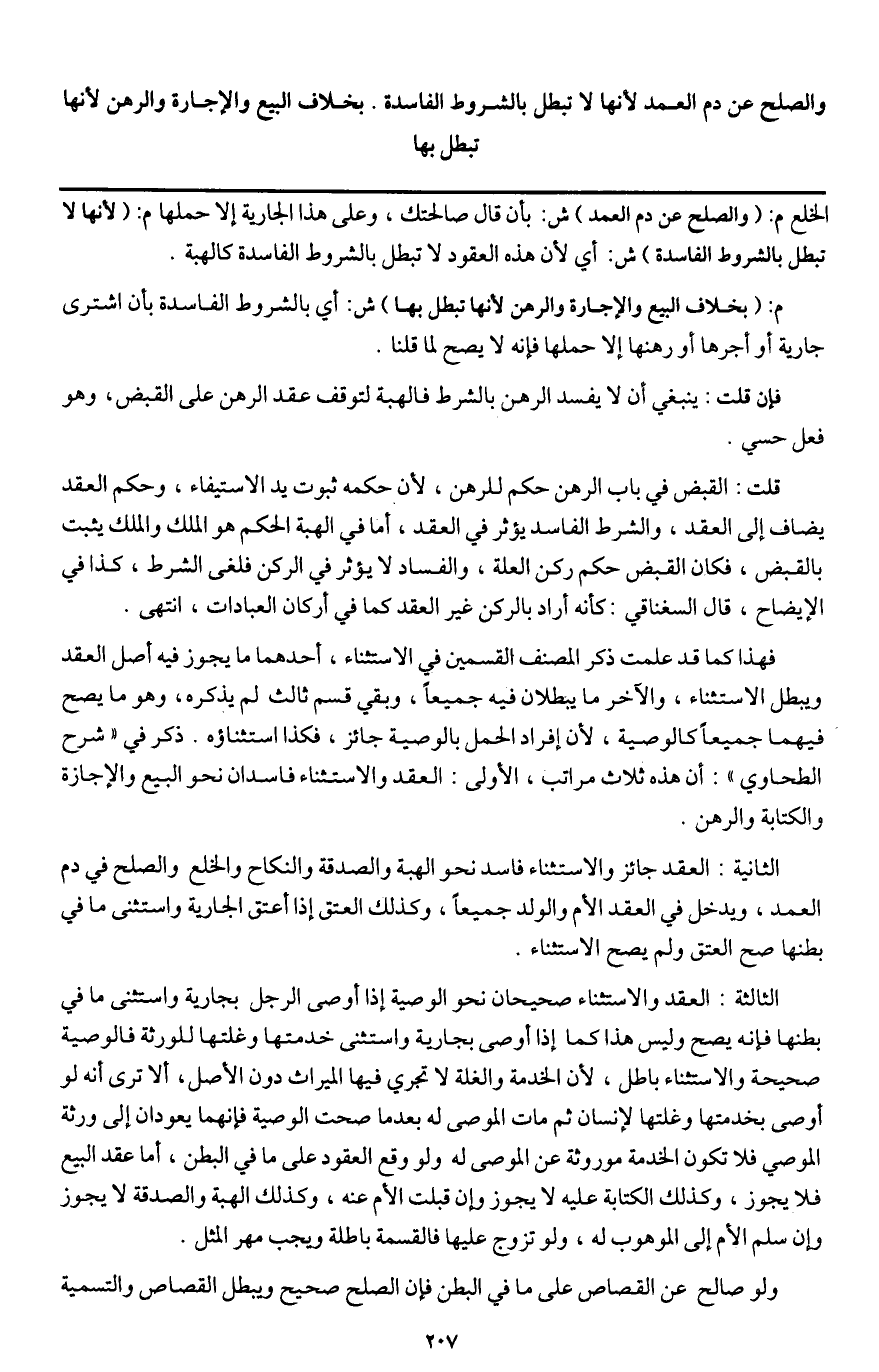 فهذا كما قد علمت ذكر المصنف القسمين في الاستثناء، أحدهما ما يجوز فيه أصل العقد ويبطل الاستثناء، والآخر ما يبطلان فيه جميعا، وبقي قسم ثالث لم يذكره، وهو ما يصح فيهما جميعا كالوصية؛ لأن إفراد الحمل بالوصية جائز، فكذا استثناؤه. ذكر في " شرح الطحاوي ": أن هذه ثلاث مراتب، الأولى: العقد والاستثناء فاسدان نحو البيع والإجازة والكتابة والرهن.