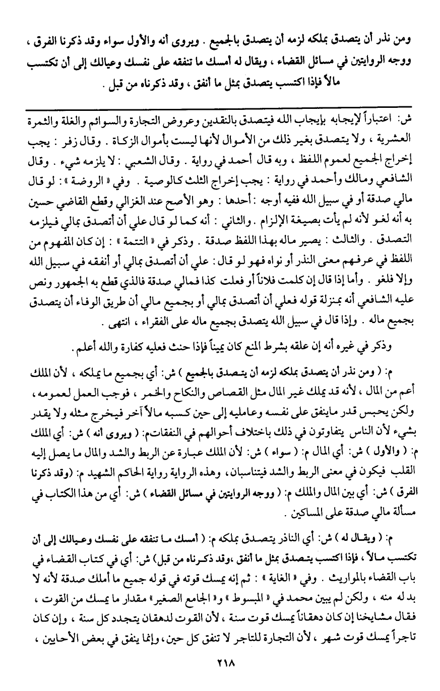ومن نذر أن يتصدق بملكه لزمه أن يتصدق بالجميع. ويروى أنه والأول سواء وقد ذكرنا الفرق، ووجه الروايتين في مسائل القضاء، ويقال له أمسك ما تنفقه على نفسك وعيالك إلى أن تكتسب مالا فإذا اكتسب يتصدق بمثل ما أنفق، وقد ذكرناه من قبل.