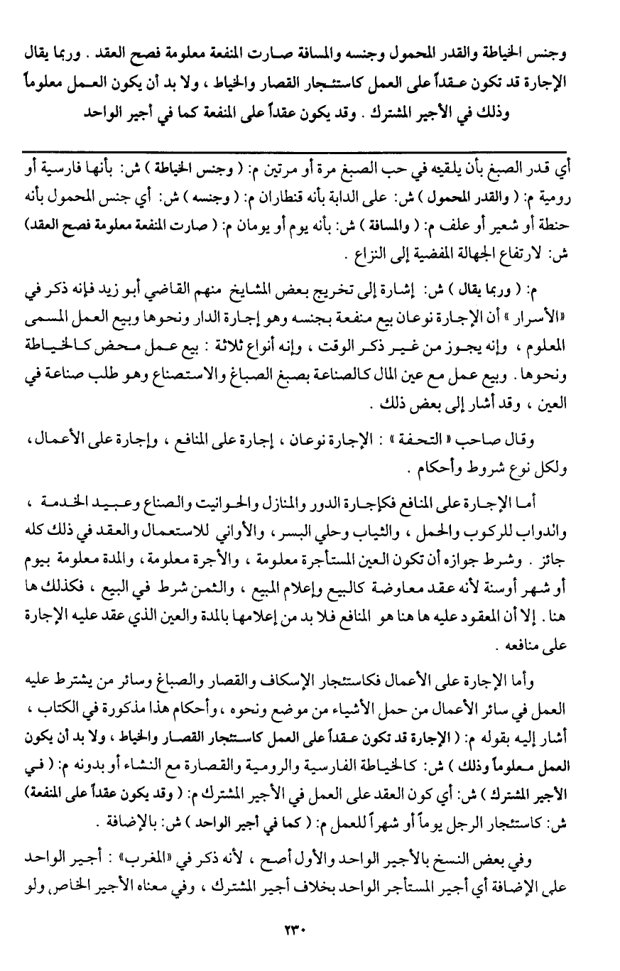 وجنس الخياطة والقدر المحمول وجنسه والمسافة صارت المنفعة معلومة فصح العقد. وربما يقال الإجارة قد تكون عقدا على العمل كاستئجار القصار والخياط، ولا بد أن يكون العمل معلوما وذلك في الأجير المشترك. وقد يكون عقدا على المنفعة كما في أجير الواحد.