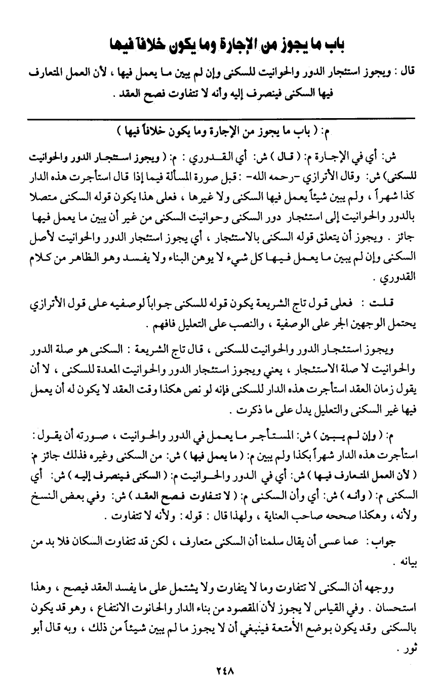 ويجوز استئجار الدور والحوانيت للسكنى، قال تاج الشريعة: السكنى هو صلة الدور والحوانيت لا صلة الاستئجار، يعني ويجوز استئجار الدور والحوانيت المعدة للسكنى، لا أن يقول زمان العقد استأجرت هذه الدار للسكنى فإنه لو نص هكذا وقت العقد لا يكون له أن يعمل فيها غير السكنى والتعليل يدل على ما ذكرت.