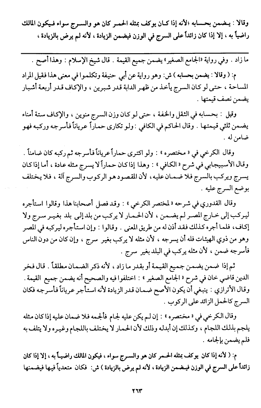 وقيل: بحسابه في الثقل والخفة، حتى لو كان وزن السرج منوين، والإكاف سته أمناء يضمن ثلثي قيمتها. وقال الحاكم في الكافي: ولو تكارى حمارا عريانا فأسرجه وركبه فهو ضامن له.