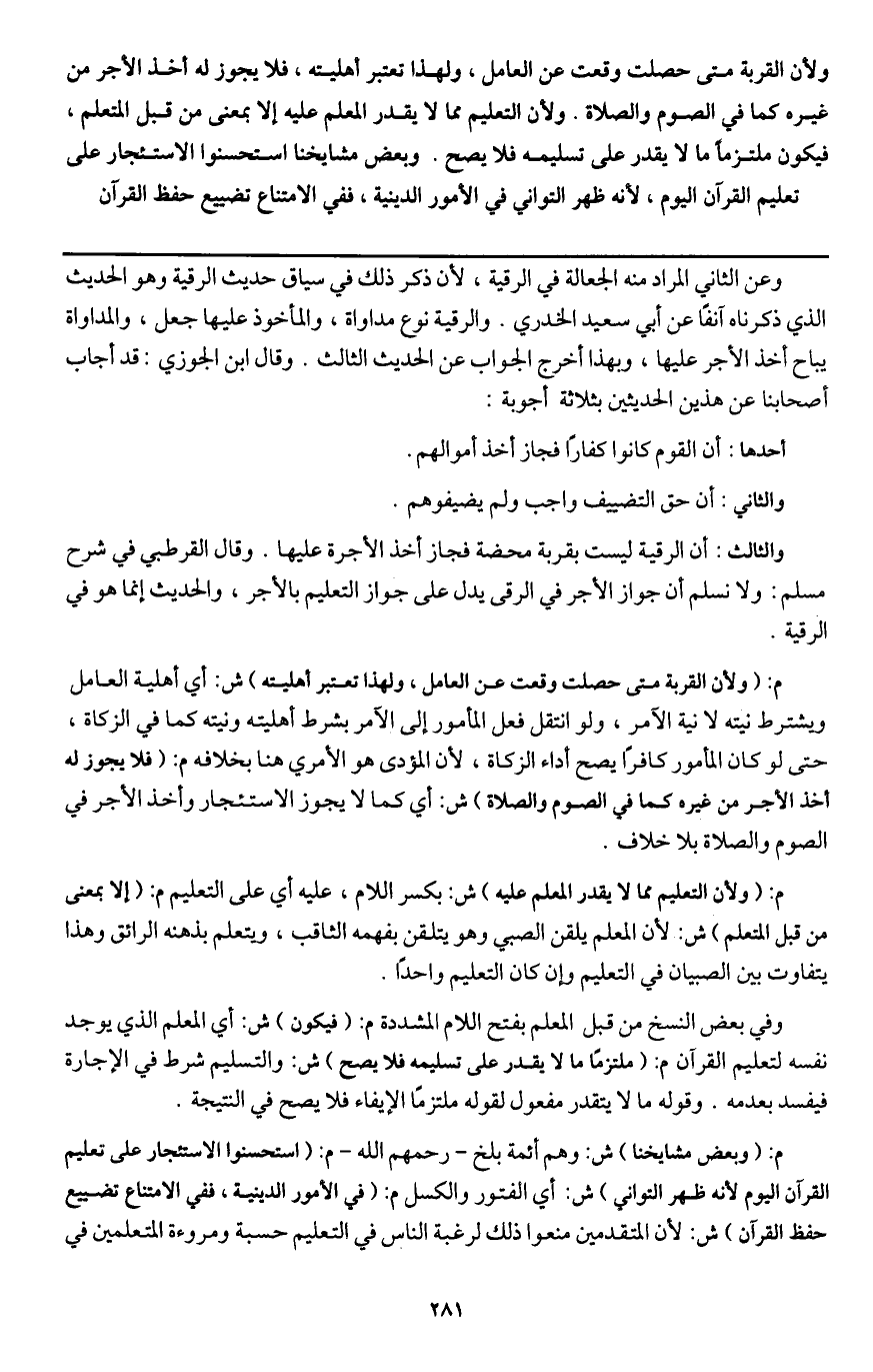 والثالث: أن الرقية ليست بقربة محضة فجاز أخذ الأجرة عليها. وقال القرطبي في شرح مسلم: ولا نسلم أن جواز الأجر في الرقى يدل على جواز التعليم بالأجر، والحديث إنما هو في الرقية.