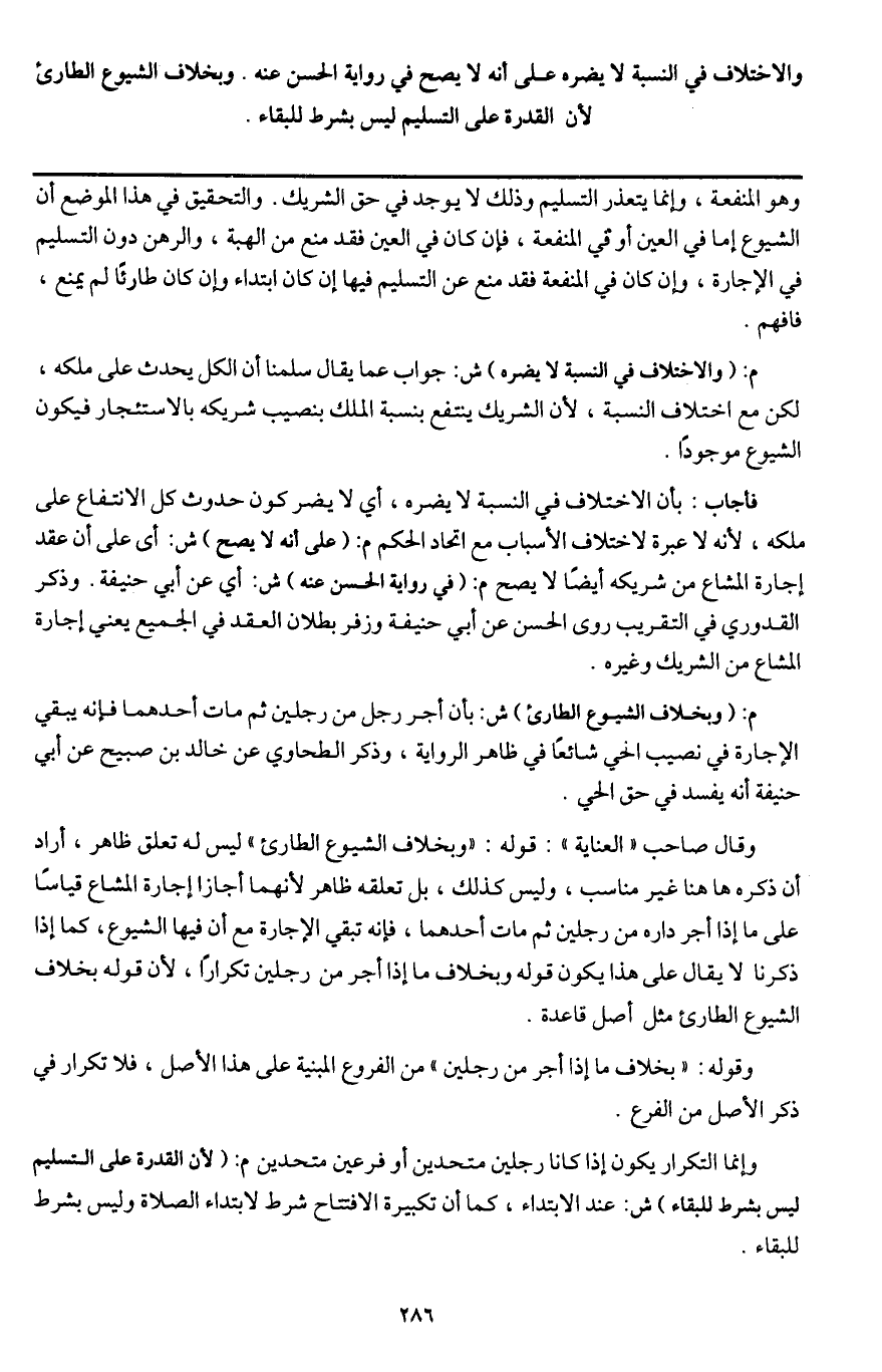 ـــــــــــــــــــــــــــــQوهو المنفعة، وإنما يتعذر التسليم وذلك لا يوجد في حق الشريك. والتحقيق في هذا الموضع أن الشيوع إما في العين أو في المنفعة، فإن كان في العين فقد منع من الهبة، والرهن دون التسليم في الإجارة، وإن كان في المنفعة فقد منع عن التسليم فيها إن كان ابتداء وإن كان طارئا لم يمنع، فافهم.