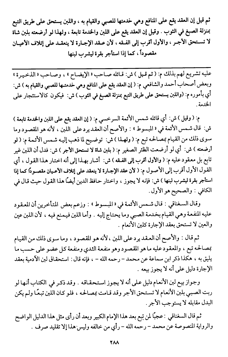 وقال السغناقي: قال شمس الأئمة في " المبسوط ": وزعم بعض المتأخرين أن المعقود عليه المنفعة وهي القيام بخدمة الصبي وما يحتاج إليه. وأما اللبن فيمنع فيه، لأن اللبن عين والعين لا تستحق بعقد الإجارة كلبن الأنعام.