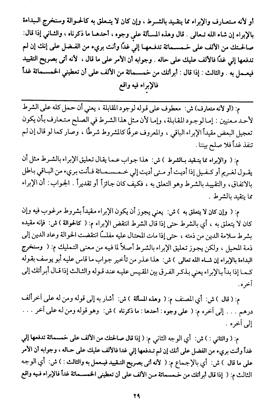 أو لأنه متعارف، والإبراء مما يتقيد بالشرط، وإن كان لا يتعلق به كالحوالة وسنخرج البداءة بالإبراء إن شاء الله تعالى.
