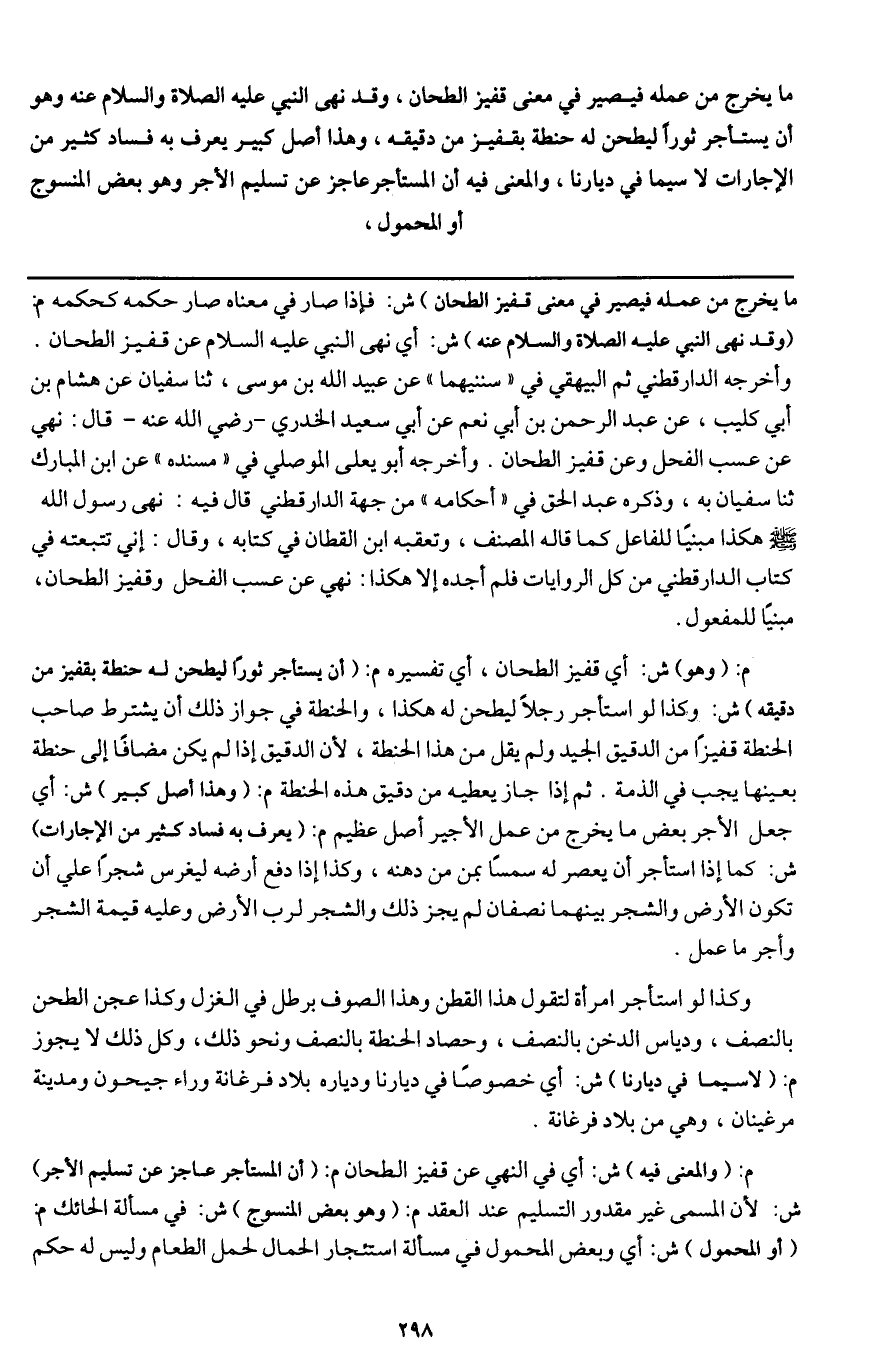 ما يخرج من عمله فيصير في معنى قفيز الطحان، وقد نهى النبي - عَلَيْهِ الصَّلَاةُ وَالسَّلَامُ - عنه وهو أن يستأجر ثورا ليطحن له حنطة بقفيز من دقيقه، وهذا أصل كبير يعرف به فساد كثير من الإجارات لا سيما في ديارنا، والمعنى فيه أن المستأجر عاجز عن تسليم الأجر وهو بعض المنسوج أو المحمول