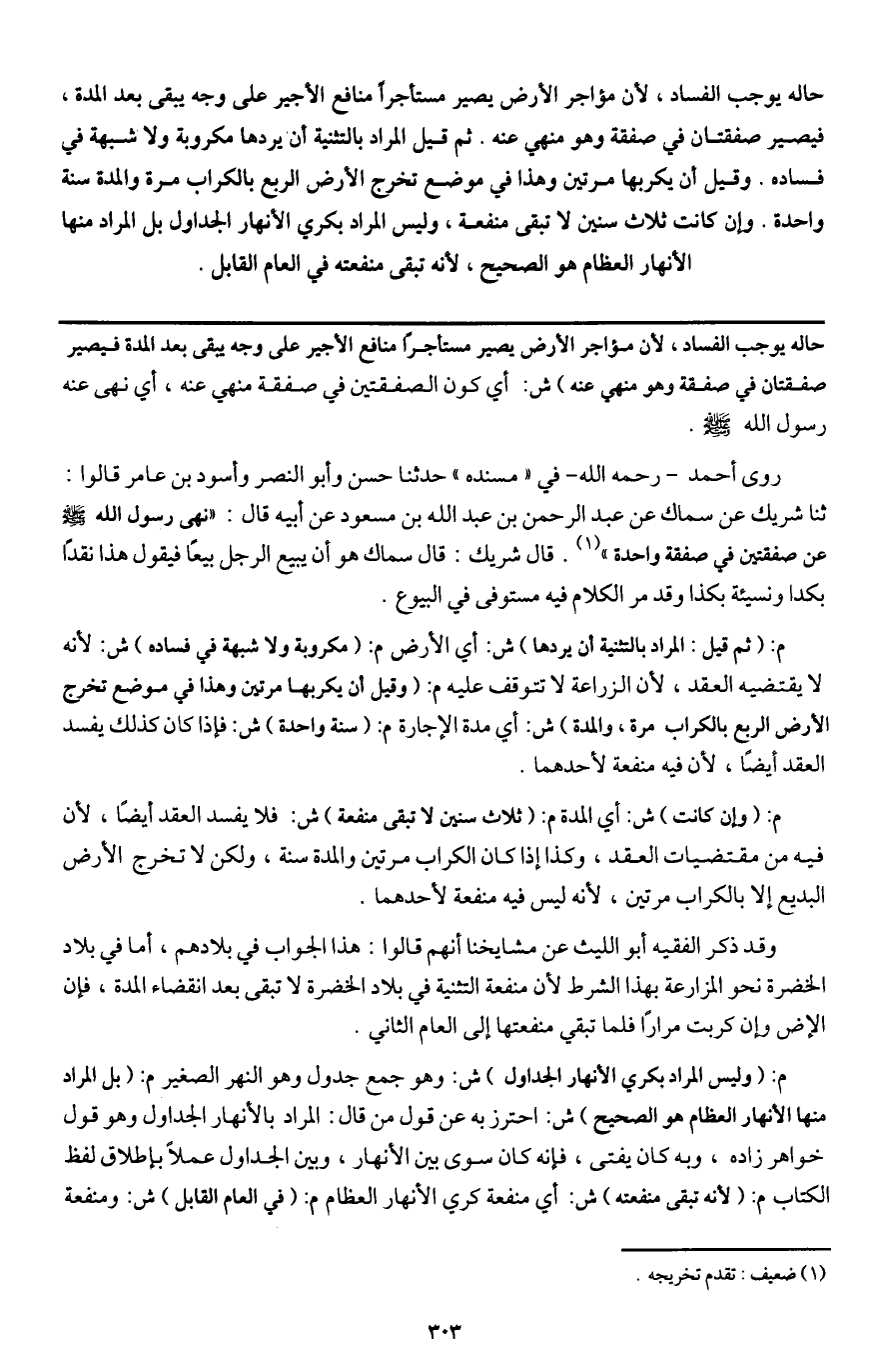 حاله يوجب الفساد؛ لأن مؤاجر الأرض يصير مستأجرا منافع الأجير على وجه يبقى بعد المدة، فيصير صفقتان في صفقة وهو منهي عنه. ثم قيل المراد بالتثنية أن يردها مكروبة ولا شبهة في فساده. وقيل أن يكربها مرتين وهذا في موضع تخرج الأرض الربع بالكراب مرة والمدة سنة واحدة. وإن كانت ثلاث سنين لا تبقى منفعة، وليس المراد بكري الأنهار الجداول بل المراد منها الأنهار العظام هو الصحيح، لأنه تبقى منفعته في العام القابل.