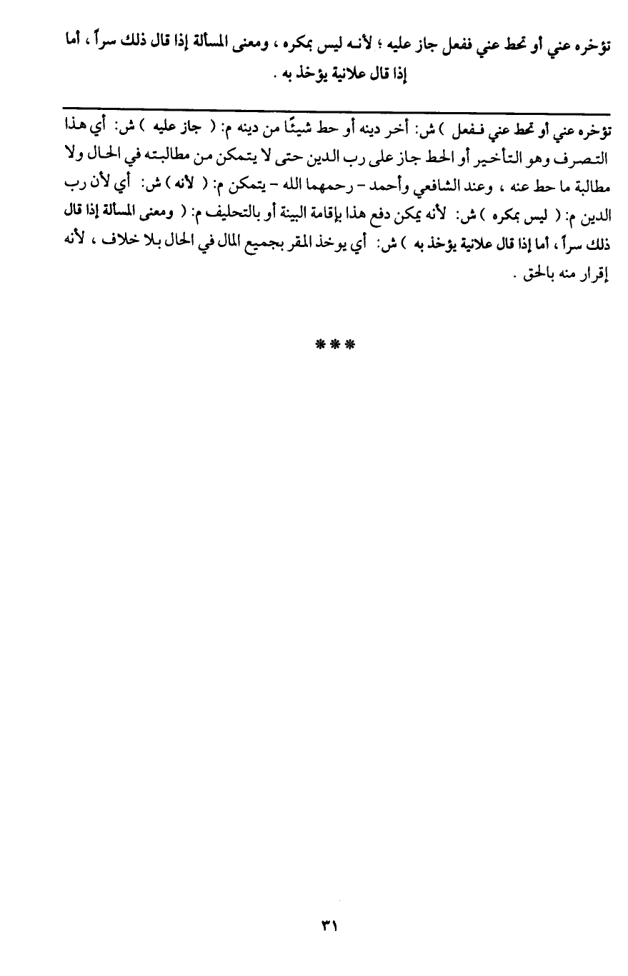 ـــــــــــــــــــــــــــــQتؤخره عني أو تحط عني ففعل) ش: أخر دينه أو حط شيئا من دينه م: (جاز عليه) ش: أي هذا التصرف وهو التأخير أو الحط جاز على رب الدين حتى لا يتمكن من مطالبته في الحال ولا مطالبة ما حط عنه، وعند الشافعي وأحمد - رحمهما الله - يتمكن م: (لأنه) ش: أي لأن رب الدين م: (ليس بمكره) ش: لأنه يمكن دفع هذا بإقامة البينة أو بالتحليف م: (ومعنى المسألة إذا قال ذلك سرا، أما إذا قال علانية يؤخذ به) ش: أي يؤخذ المقر بجميع المال في الحال بلا خلاف، لأنه إقرار منه بالحق.