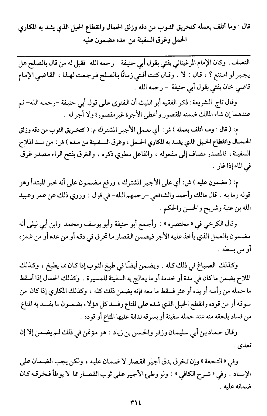 م: (مضمون عليه) ش: أي على الأجير المشترك، ورفع مضمون على أنه خبر المبتدأ وهو قوله وما به. قال مالك وأحمد والشافعي - رَحِمَهُمُ اللَّهُ - في قول: وروي ذلك عن عمر وعبيد الله بن عتبة وشريح والحسن والحكم.