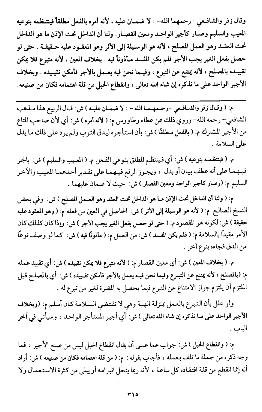 وقال زفر والشافعي - رحمهما الله -: لا ضمان عليه؛ لأنه أمره بالفعل مطلقا فينتظمه بنوعيه المعيب والسليم وصار كأجير الواحد ومعين القصار. ولنا أن الداخل تحت الإذن ما هو الداخل تحت العقد وهو العمل المصلح؛ لأنه هو الوسيلة إلى الأثر وهو المعقود عليه حقيقة. حتى لو حصل بفعل الغير يجب الأجر فلم يكن المفسد مأذونا فيه. بخلاف المعين؛ لأنه متبرع فلا يمكن تقييده بالمصلح؛ لأنه يمتنع عن التبرع، وفيما نحن فيه يعمل بالأجر فأمكن تقييده. وبخلاف الأجير الواحد على ما نذكره إن شاء الله تعالى، وانقطاع الحبل من قلة اهتمامه فكان من صنيعه.