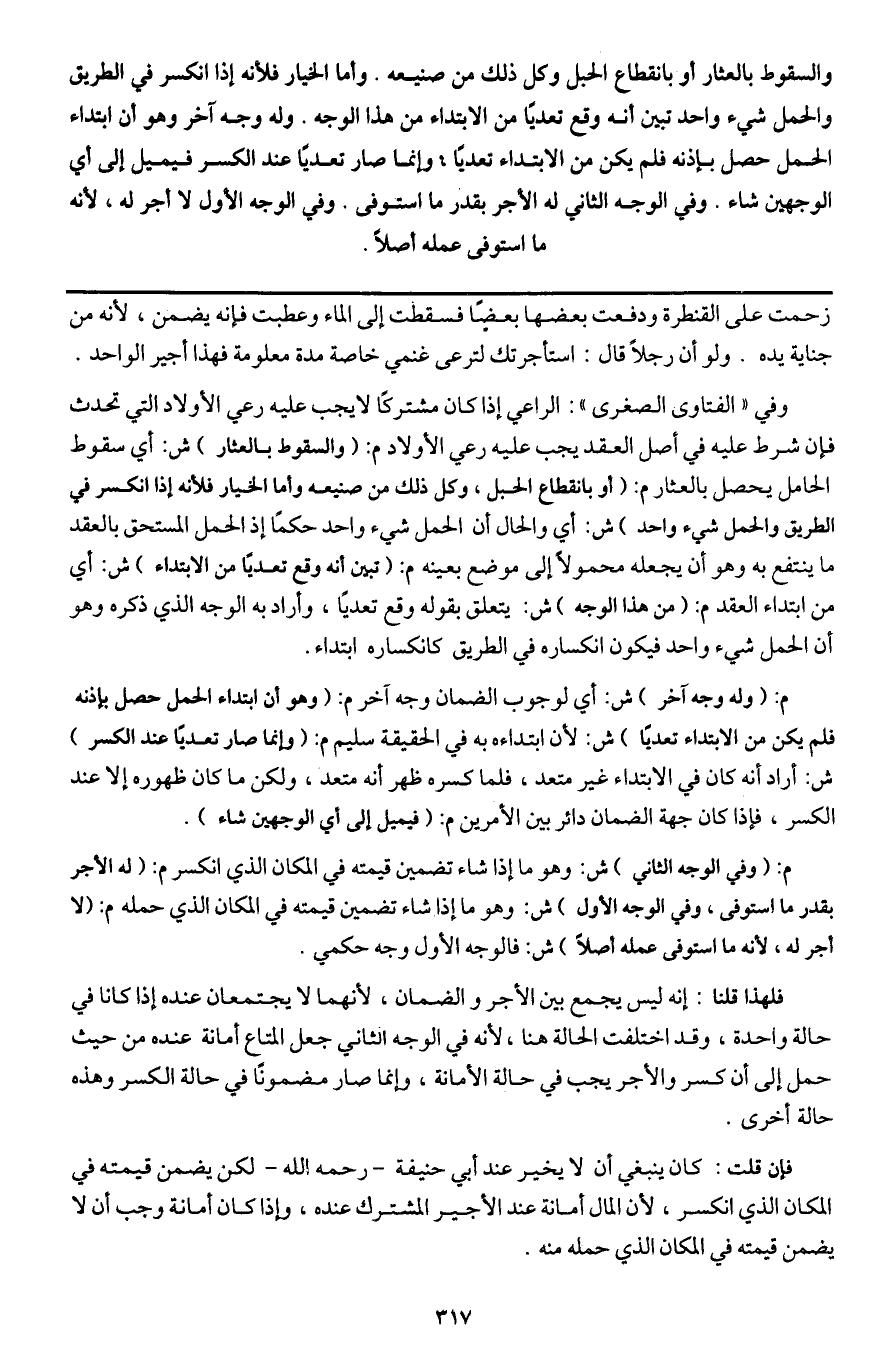 والسقوط بالعثار أو بانقطاع الحبل وكل ذلك من صنيعه. وأما الخيار فلأنه إذا انكسر في الطريق والحمل شيء واحد تبين أنه وقع تعديا من الابتداء من هذا الوجه. وله وجه آخر وهو أن ابتداء الحمل حصل بإذنه فلم يكن من الابتداء تعديا عند الكسر فيميل إلى أي الوجهين شاء. وفي الوجه الثاني له الأجر بقدر ما استوفى. وفي الوجه الأول لا أجر له؛ لأنه ما استوفى عمله أصلا.