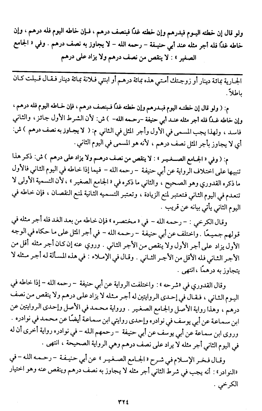وقال القدوري في " شرحه ": واختلفت الرواية عن أبي حنيفة - رَحِمَهُ اللَّهُ - إذا خاطه في اليوم الثاني، فقال في إحدى الروايتين له أجر مثله لا يزاد على درهم ولا ينقص من نصف درهم، وهذا رواية الأصل والجامع الصغير. ورواية محمد في الأصل وإحدى الروايتين عن ابن سماعة عن أبي يوسف في نوادره وإحدى روايتي ابن سماعة أيضا عن محمد في نوادره. وروى ابن سماعة عن أبي يوسف عن أبي حنيفة - رَحِمَهُ اللَّهُ - في نوادره رواية أخرى أن له في اليوم الثاني أجر مثله لا يزاد على نصف درهم وهي الرواية الصحيحة، انتهى.