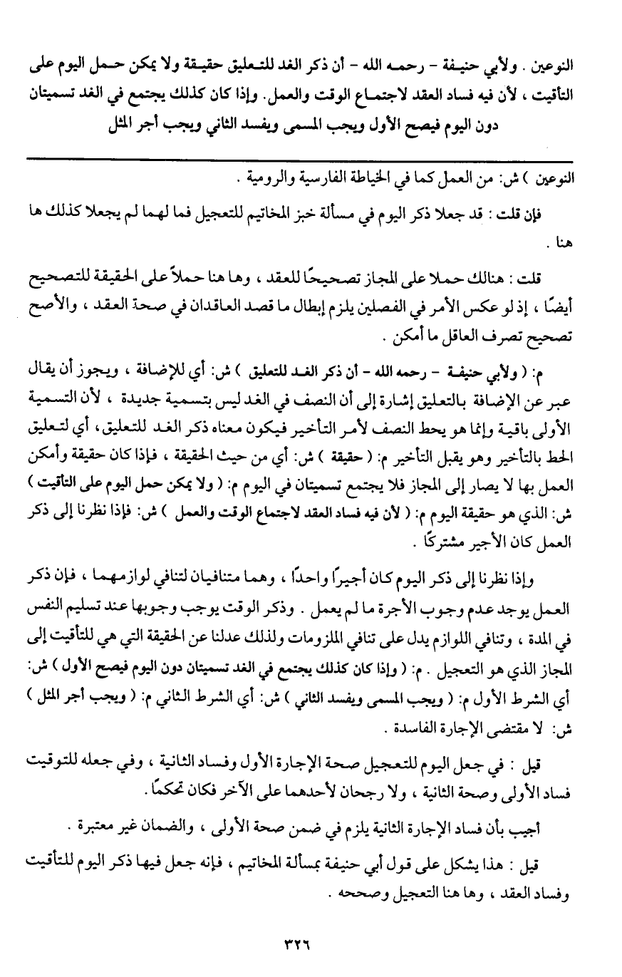 النوعين ولأبي حنيفة - رَحِمَهُ اللَّهُ - أن ذكر الغد للتعليق حقيقة ولا يمكن حمل اليوم على التأقيت لأن فيه فساد العقد لاجتماع الوقت والعمل. وإذا كان كذلك يجتمع في الغد تسميتان دون اليوم فيصح الأول ويجب المسمي ويفسد الثاني ويجب أجر المثل