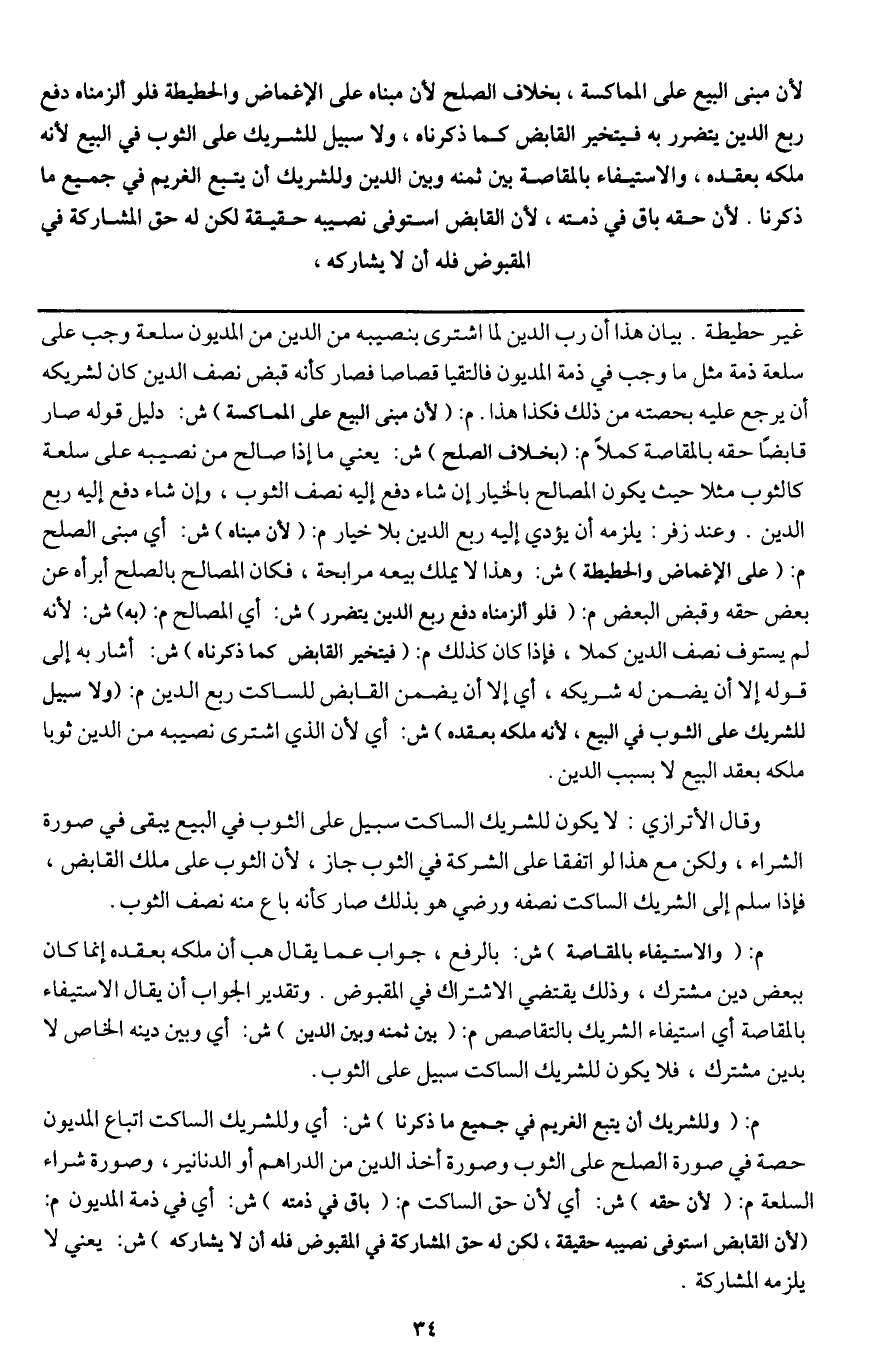 لأن مبنى البيع على المماكسة، بخلاف الصلح لأن مبناه على الإغماض والحطيطة فلو ألزمناه دفع ربع الدين يتضرر به فيتخير القابض كما ذكرناه، ولا سبيل للشريك على الثوب في البيع لأنه ملكه بعقده، والاستيفاء بالمقاصة بين ثمنه وبين الدين
