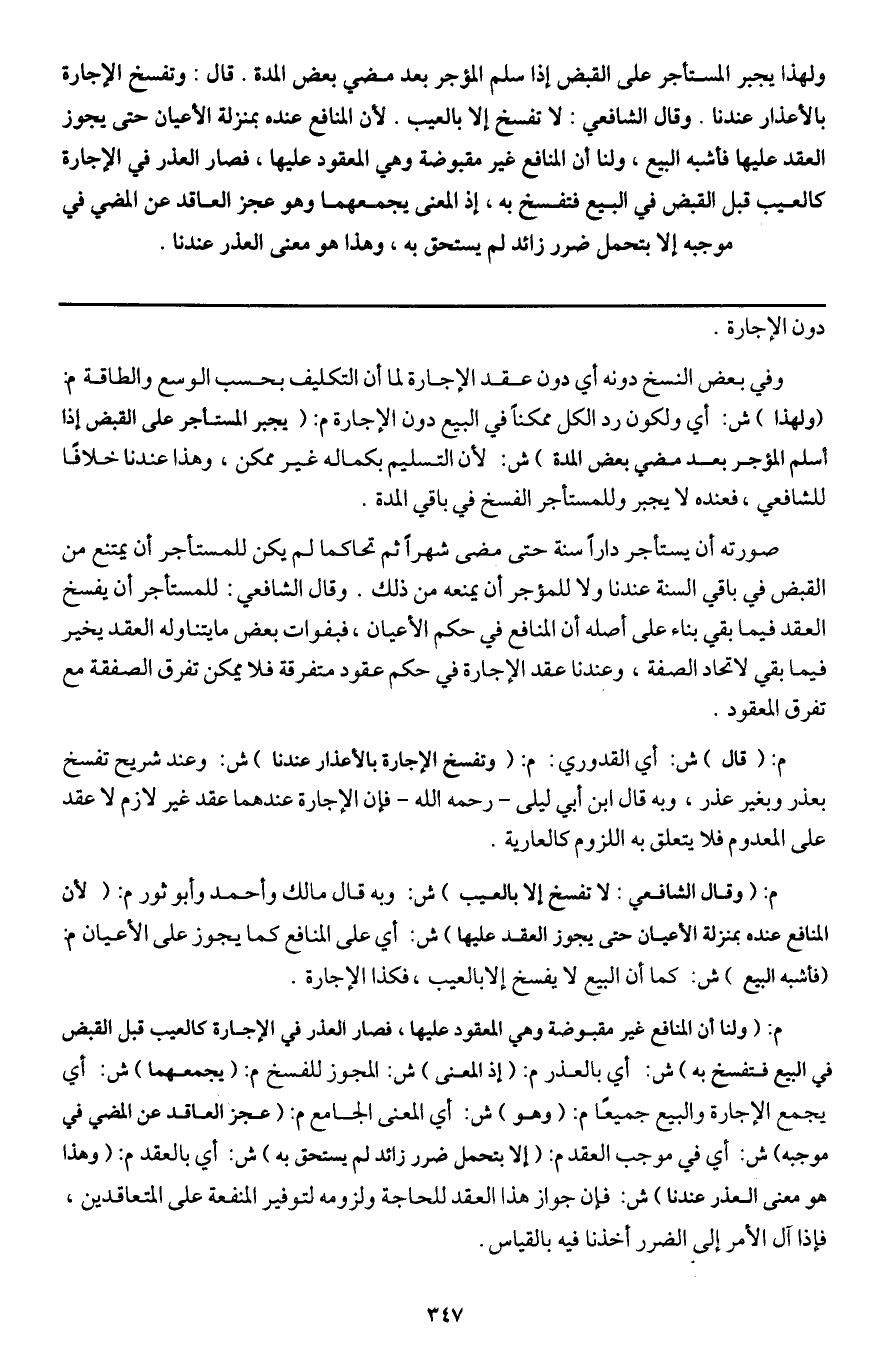 م: (قال) ش: أي القدوري: م: (وتفسخ الإجارة بالأعذار عندنا) ش: وعند شريح تفسخ بعذر وبغير عذر، وبه قال ابن أبي ليلى - رَحِمَهُ اللَّهُ - فإن الإجارة عندهما عقد غير لازم لا عقد على المعدوم فلا يتعلق به اللزوم كالعارية.