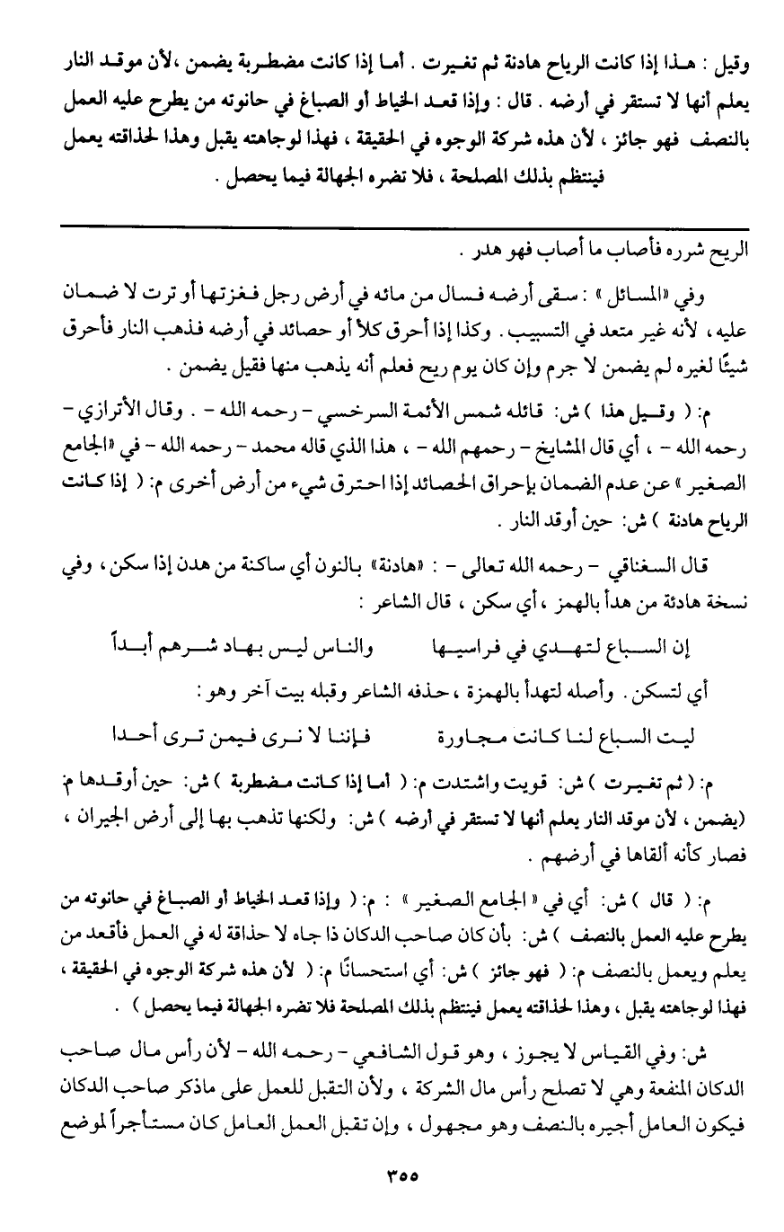 وقيل: هذا إذا كانت الرياح هادنة ثم تغيرت. أما إذا كانت مضطربة يضمن؛ لأن موقد النار يعلم أنها لا تستقر في أرضه. قال: وإذا قعد الخياط أو الصباغ في حانوته من يطرح عليه العمل بالنصف فهو جائز؛ لأن هذه شركة الوجوه في الحقيقة، فهذا لوجاهته يقبل وهذا لحذاقته يعمل فينتظم بذلك المصلحة، فلا تضره الجهالة فيما يحصل.