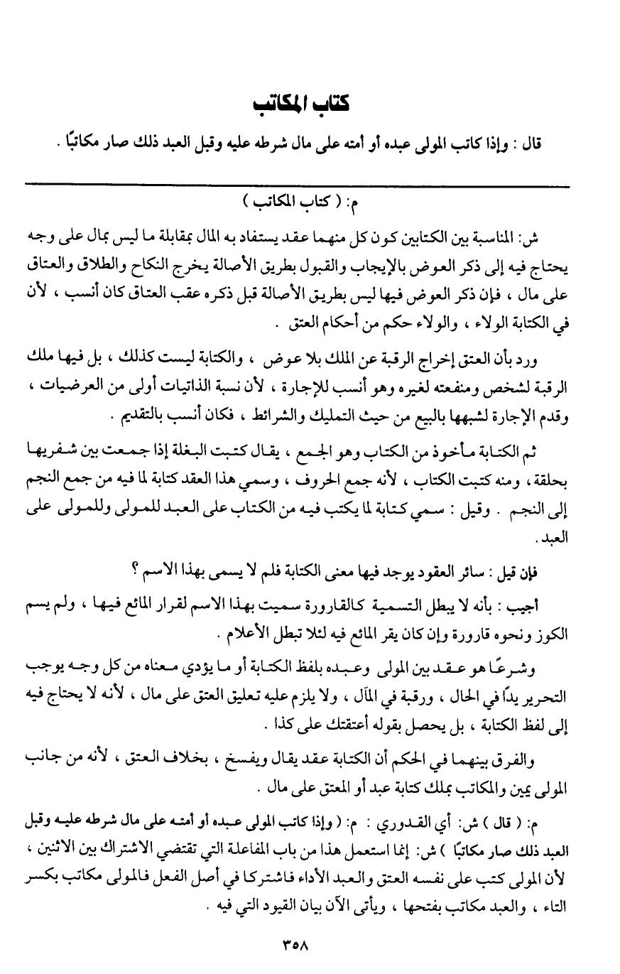 وشرعا هو عقد بين المولى وعبده بلفظ الكتابة أو ما يؤدي معناه من كل وجه يوجب التحرير يدا في الحال، ورقبة في المآل، ولا يلزم عليه تعليق العتق على مال، لأنه لا يحتاج فيه إلى لفظ الكتابة، بل يحصل بقوله أعتقتك على كذا.