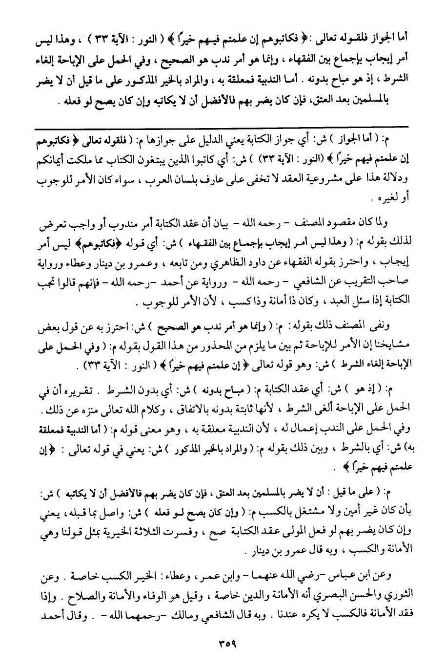 أما الجواز فلقوله تعالى: {فَكَاتِبُوهُمْ إِنْ عَلِمْتُمْ فِيهِمْ خَيْرًا} [النور: 33] (النور: الآية 33) ، وهذا ليس أمر إيجاب بإجماع بين الفقهاء، وإنما هو أمر ندب هو الصحيح، وفي الحمل على الإباحة إلغاء الشرط، إذ هو مباح بدونه. أما الندبية فمعلقة به، والمراد بالخير المذكور على ما قيل أن لا يضر بالمسلمين بعد العتق، فإن كان يضر بهم فالأفضل أن لا يكاتبه وإن كان يصح لو فعله.
