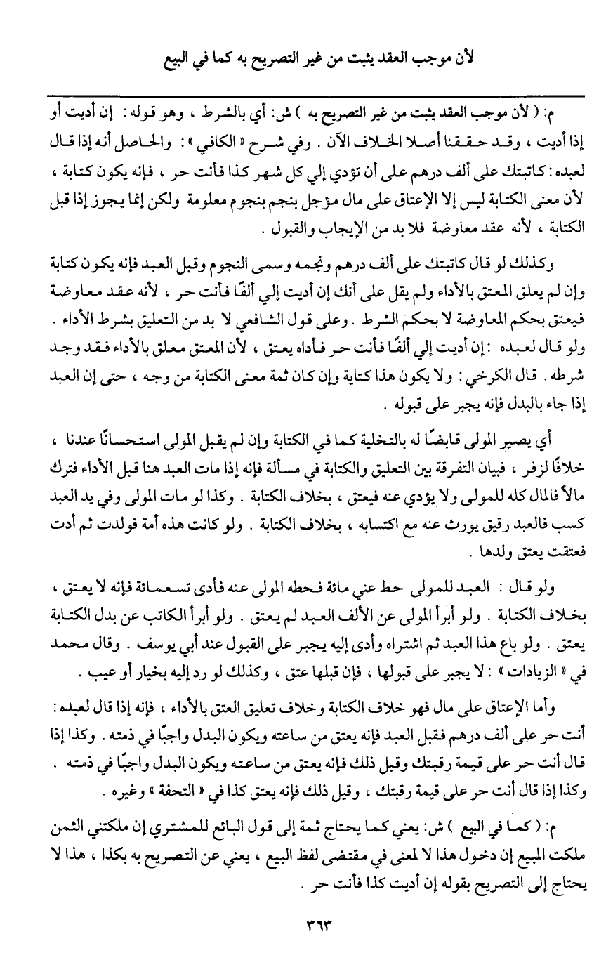 م: (كما في البيع) ش: يعني كما يحتاج ثمة إلى قول البائع للمشتري إن ملكتني الثمن ملكت المبيع إن دخول هذا لا لمعنى في مقتضى لفظ البيع، يعني عن التصريح به بكذا، هذا لا يحتاج إلى التصريح بقوله إن أديت كذا فأنت حر.