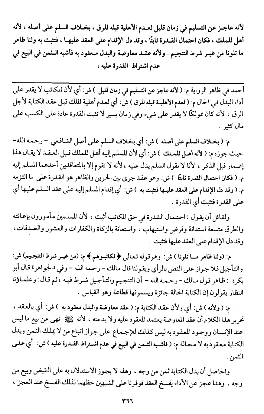 ـــــــــــــــــــــــــــــQأحمد في ظاهر الرواية م: (لأنه عاجز عن التسليم في زمان قليل) ش: أي لأن المكاتب لا يقدر على أداء البدل في الحال م: (لعدم الأهلية قبله للرق) ش: أي لعدم أهلية الملك قبل عقد الكتابة لأجل الرق، لأنه كان مملوكا لا يقدر على شيء وفي زمان يسير لا تثبت القدرة عادة على الكسب على مال كثير.