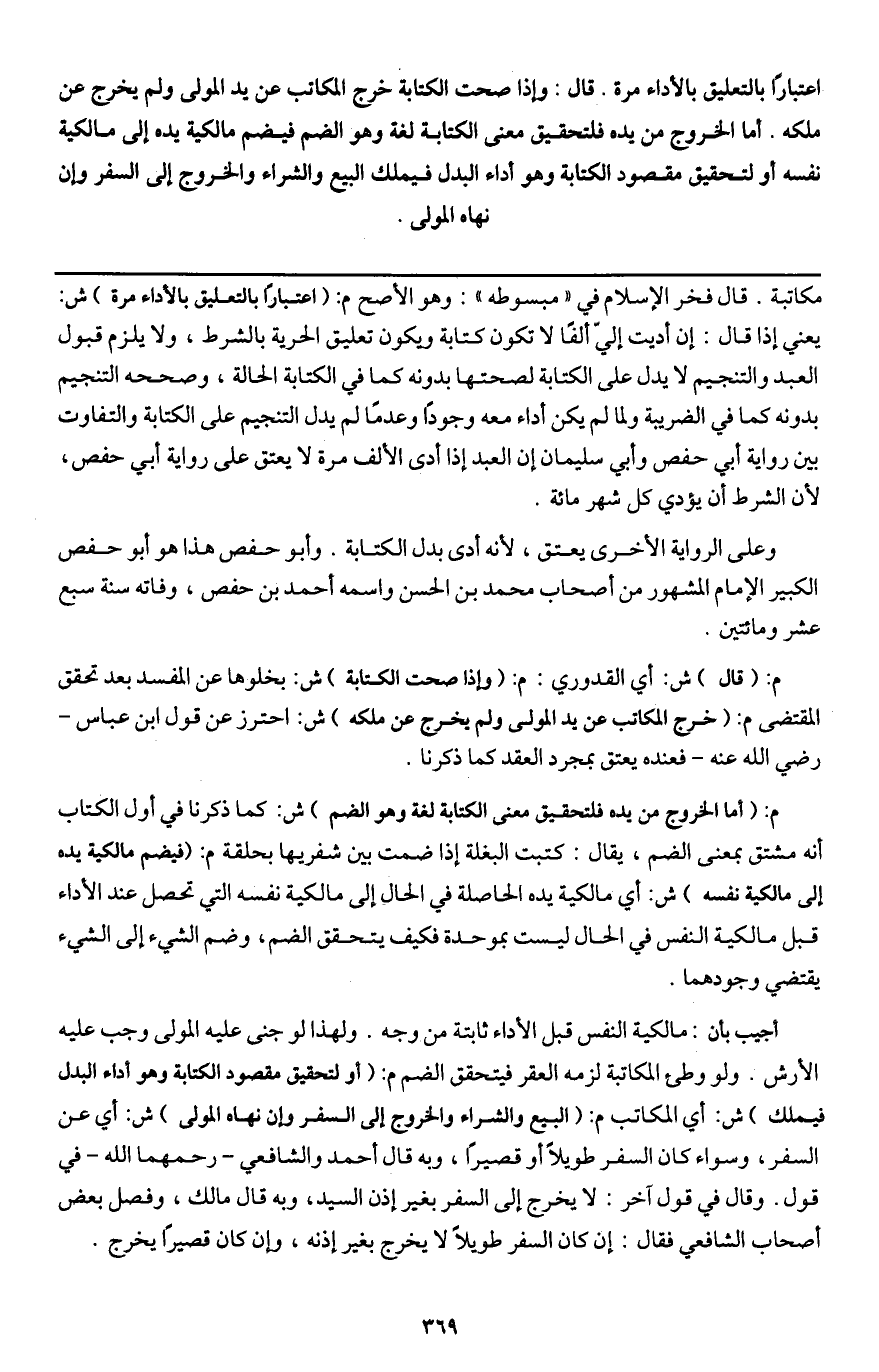 وعلى الرواية الأخرى يعتق، لأنه أدى بدل الكتابة. وأبو حفص هذا هو أبو حفص الكبير الإمام المشهور من أصحاب محمد بن الحسن واسمه أحمد بن حفص، وفاته سنة سبع عشر ومائتين.