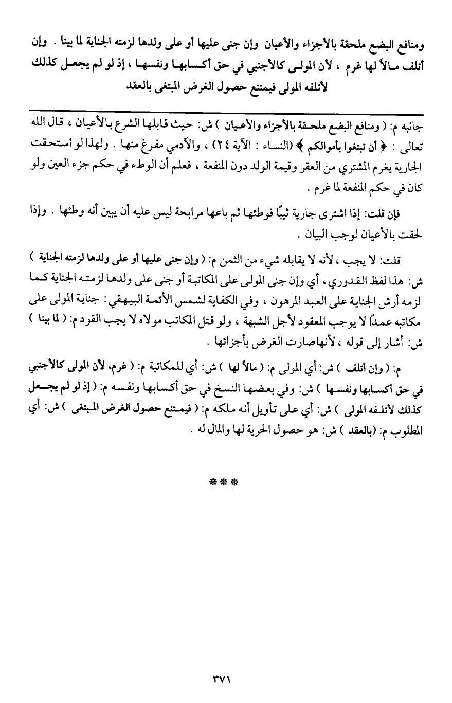 ـــــــــــــــــــــــــــــQجانبه م: (ومنافع البضع ملحقة بالأجزاء والأعيان) ش: حيث قابلها الشرع بالأعيان، قال الله تعالى: {أَنْ تَبْتَغُوا بِأَمْوَالِكُمْ} [النساء: 24] (النساء: الآية 24) ، والآدمي مفرغ منها. ولهذا لو استحقت الجارية يغرم المشتري من العقر وقيمة الولد دون المنفعة، فعلم أن الوطء في حكم جزء العين ولو كان في حكم المنفعة لما غرم.