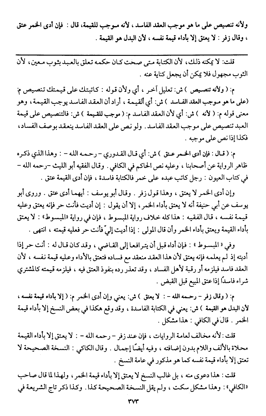 قلت: هذا دعوى منه، بل غالب النسخ لا يعتق إلا بأداء قيمة الخمر، ولهذا لما قال صاحب " الكافي ": وهذا مشكل سكت، ولم يقل النسخة الصحيحة كذا. وكذا ذكر تاج الشريعة في