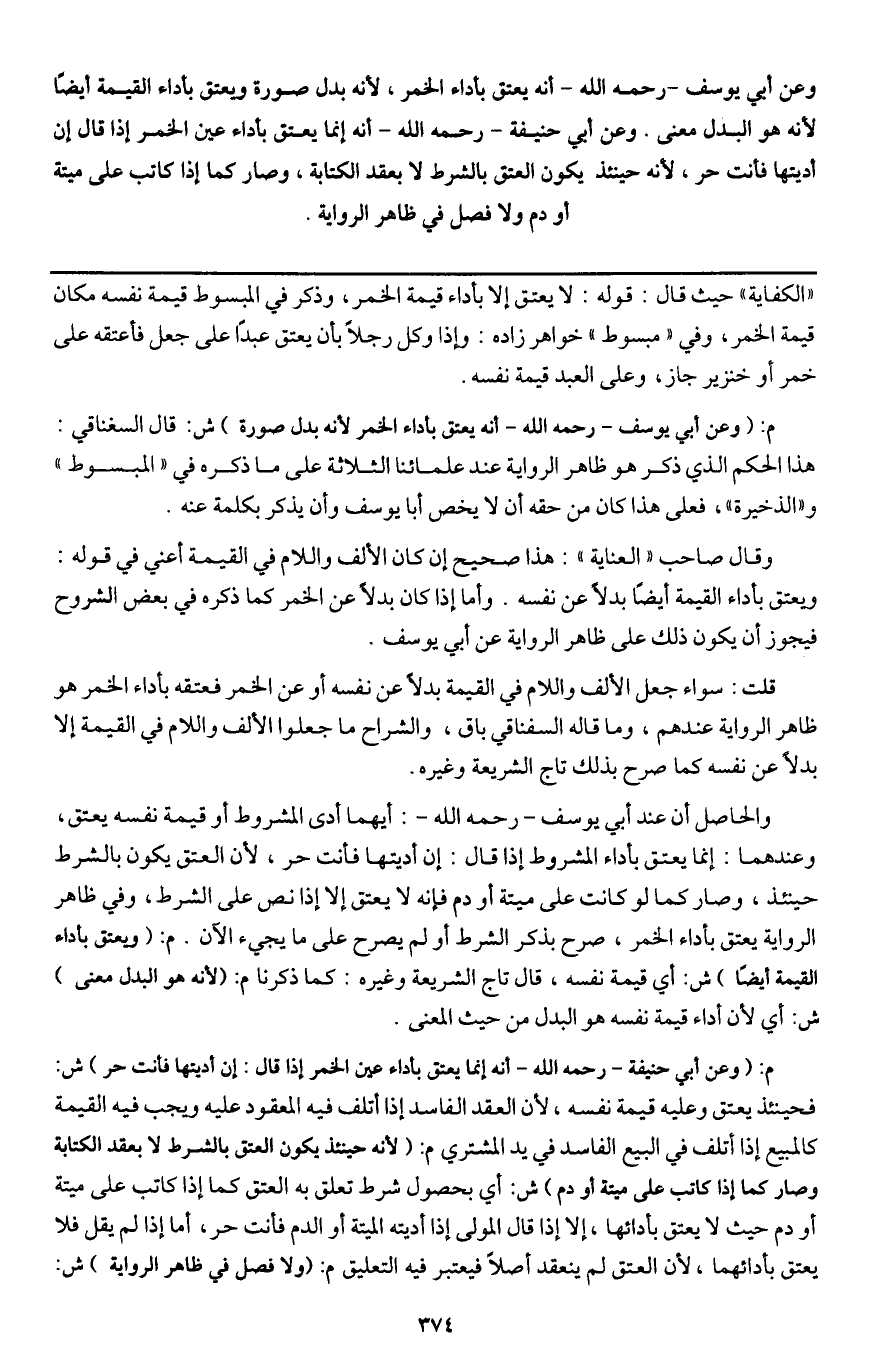 وقال صاحب " العناية ": هذا صحيح إن كان الألف واللام في القيمة أعني في قوله: ويعتق بأداء القيمة أيضا بدلا عن نفسه. وأما إذا كان بدلا عن الخمر كما ذكره في بعض الشروح فيجوز أن يكون ذلك على ظاهر الرواية عن أبي يوسف.