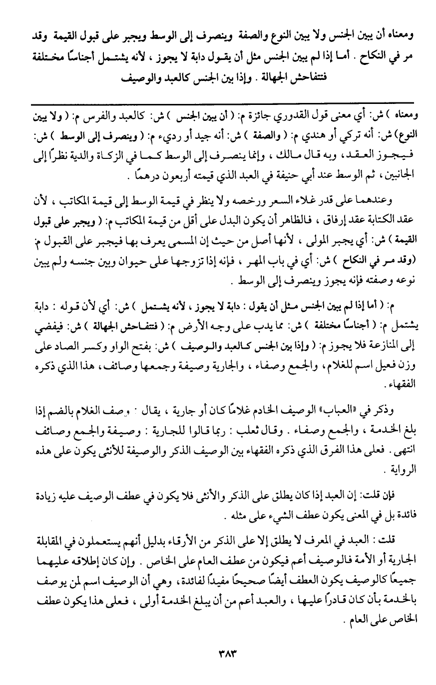 م: (أما إذا لم يبين الجنس مثل أن يقول: دابة لا يجوز، لأنه يشتمل) ش: أي لأن قوله: دابة يشتمل م: (أجناسا مختلفة) ش: مما يدب على وجه الأرض م: (فتتفاحش الجهالة) ش: فيفضي إلى المنازعة فلا يجوز م: (وإذا بين الجنس كالعبد والوصيف) ش: بفتح الواو وكسر الصاد على وزن فعيل اسم للغلام، والجمع وصفاء، والجارية وصيفة وجمعها وصائف، هذا الذي ذكره الفقهاء.