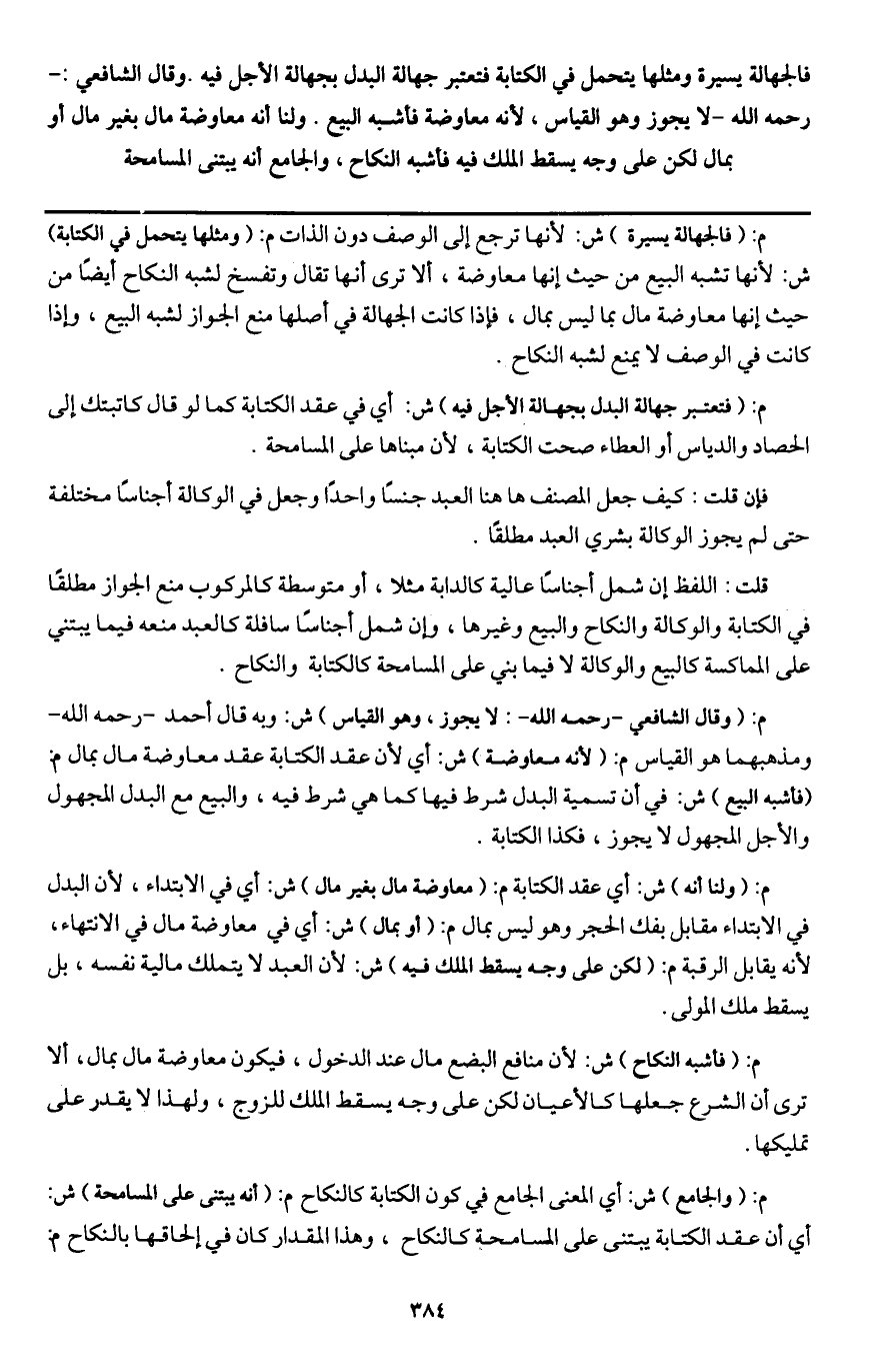 م: (فتعتبر جهالة البدل بجهالة الأجل فيه) ش: أي في عقد الكتابة كما لو قال كاتبتك إلى الحصاد والدياس أو العطاء صحت الكتابة، لأن مبناها على المسامحة.