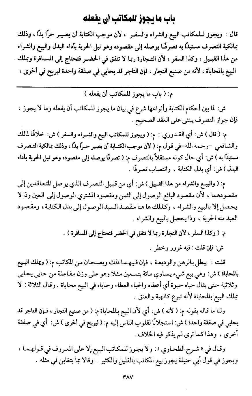 باب ما يجوز للمكاتب أن يفعله قال: ويجوز للمكاتب البيع والشراء والسفر؛ لأن موجب الكتابة أن يصير حرا يدا، وذلك بمالكية التصرف مستبدا به تصرفا يوصله إلى مقصوده وهو نيل الحرية بأداء البدل والبيع والشراء من هذا القبيل، وكذا السفر؛ لأن التجارة ربما لا تتفق في الحضر فتحتاج إلى المسافرة ويملك البيع بالمحاباة؛ لأنه من صنيع التجار، فإن التاجر قد يحابي في صفقة واحدة ليربح في أخرى،