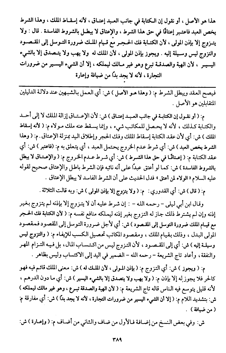 هذا هو الأصل، قال: ولا يتزوج إلا بإذن المولى؛ لأن الكتابة فك الحجر مع قيام الملك ضرورة التوسل إلى المقصود والتزوج ليس وسيلة إليه. ويجوز بإذن المولى؛ لأن الملك له ولا يهب ولا يتصدق إلا بالشيء اليسير؛ لأن الهبة والصدقة تبرع وهو غير مالك ليملكه، إلا أن الشيء اليسير من ضرورات التجارة؛ لأنه لا يجد بدا من ضيافة وإعارة