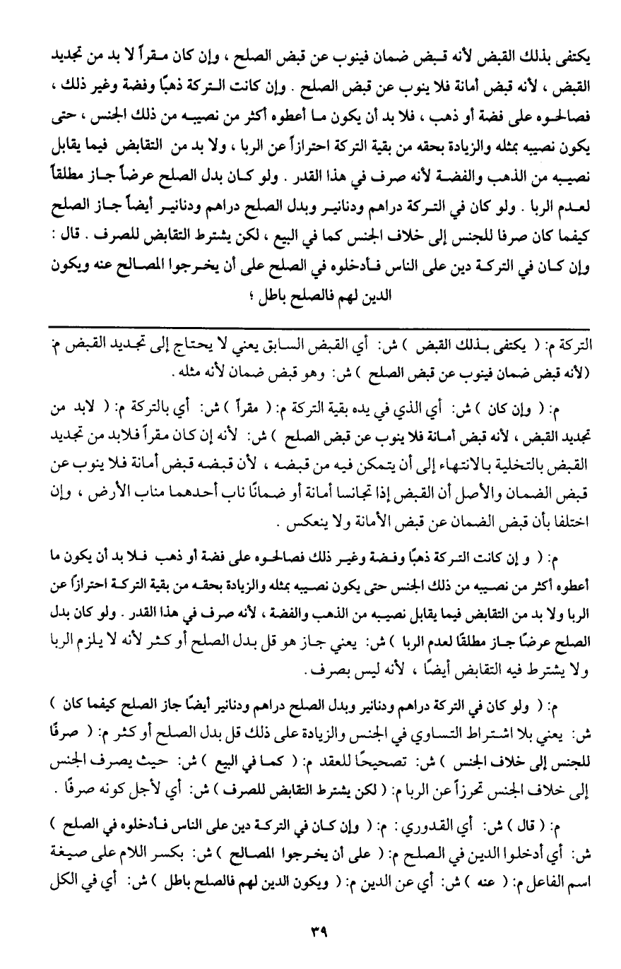 وإن كانت التركة ذهبا وفضة وغير ذلك، فصالحوه على فضة أو ذهب، فلا بد أن يكون ما أعطوه أكثر من نصيبه من ذلك الجنس، حتى يكون نصيبه بمثله والزيادة بحقه من بقية التركة احترازا عن الربا، ولا بد من التقابض فيما يقابل نصيبه من الذهب والفضة لأنه صرف في هذا القدر. ولو كان بدل الصلح عرضا جاز مطلقا لعدم الربا. ولو كان في التركة دراهم ودنانير وبدل الصلح دراهم ودنانير أيضا جاز الصلح كيفما كان صرفا للجنس إلى خلاف الجنس كما في البيع لكن يشترط التقابض للصرف.