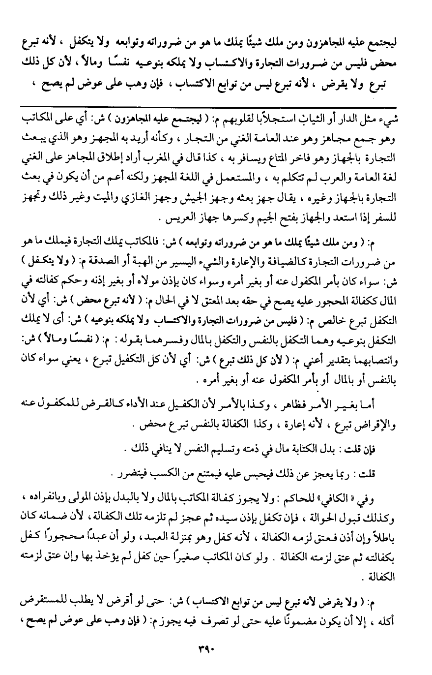 م: (ومن ملك شيئا يملك ما هو من ضروراته وتوابعه) ش: فالمكاتب يملك التجارة فيملك ما هو من ضرورات التجارة كالضيافة والإعارة والشيء اليسير من الهبة أو الصدقة م: (ولا يتكفل) ش: سواء كان بأمر المكفول عنه أو بغير أمره وسواء كان بإذن مولاه أو بغير إذنه وحكم كفالته في المال ككفالة المحجور عليه يصح في حقه بعد المعتق لا في الحال م: (لأنه تبرع محض) ش: أي لأن التكفل تبرع خالص م: (فليس من ضرورات التجارة والاكتساب ولا يملكه بنوعيه) ش: أي لا يملك التكفل بنوعيه وهما التكفل بالنفس والتكفل بالمال وفسرهما بقوله: م: (نفسا ومالا) ش: وانتصابهما بتقدير أعني م: (لأن كل ذلك تبرع) ش: أي لأن كل التكفيل تبرع، يعني سواء كان بالنفس أو بالمال أو بأمر المكفول عنه أو بغير أمره.