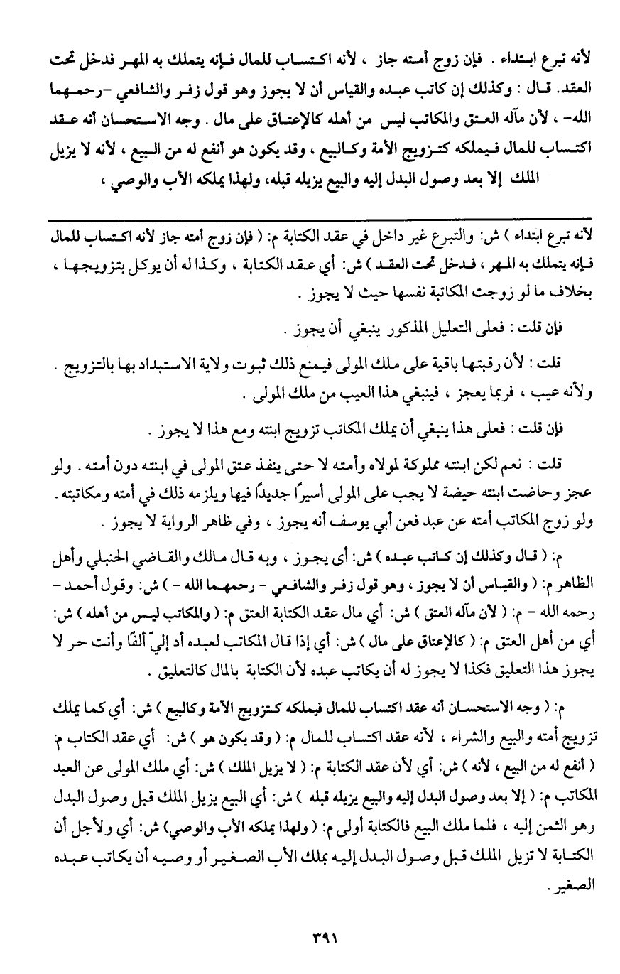 قلت: نعم لكن ابنته مملوكة لمولاه وأمته لا حتى ينفذ عتق المولى في ابنته دون أمته. ولو عجز وحاضت ابنته حيضة لا يجب على المولى أسيرا جديدا فيها ويلزمه ذلك في أمته ومكاتبته. ولو زوج المكاتب أمته عن عبد فعن أبي يوسف أنه لا يجوز، وفي ظاهر الرواية لا يجوز.
