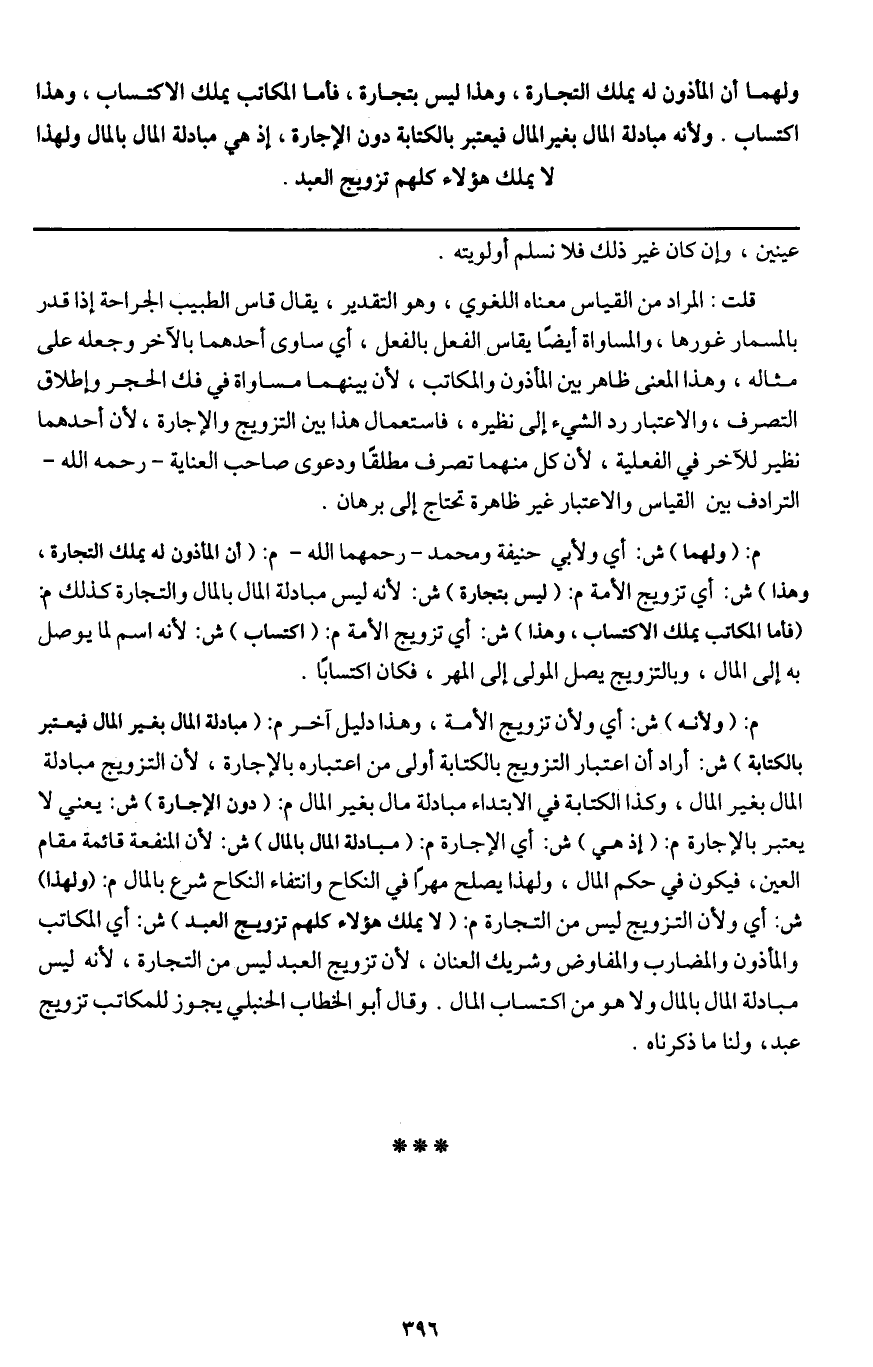 ولهما أن المأذون له يملك التجارة، وهذا ليس بتجارة، فأما المكاتب يملك الاكتساب، وهذا اكتساب. ولأنه مبادلة المال بغير المال فيعتبر بالكتابة دون الإجارة، إذ هي مبادلة المال بالمال ولهذا لا يملك هؤلاء كلهم تزويج العبد