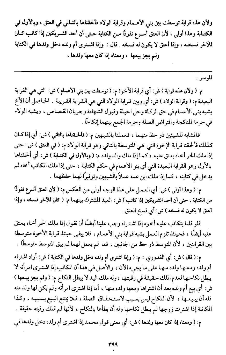 ولأن هذه قرابة توسطت بين بني الأعمام وقرابة الولاد فألحقناها بالثاني في العتق، وبالأول في الكتابة وهذا أولى؛ لأن العتق أسرع نفوذا من الكتابة حتى إن أحد الشريكين إذا كاتب كان للآخر فسخه، وإذا أعتق لا يكون له فسخه.