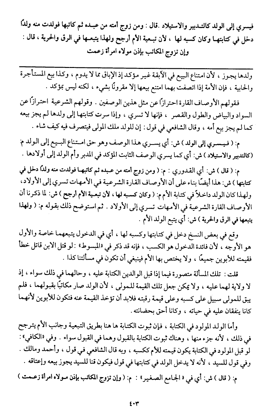 فقولهم الأوصاف القارة احترازا عن مثل هذين الوصفين. وقولهم الشرعية احترازا عن السواد والبياض والطول القصر، فإنها لا تسري، وإذا سرت كتابتها إلى ولدها لم يجز بيعه كما لم يجز بيع أمه، وقال الشافعي في قول: إن للولد ملك المولى فيتصرف فيه كيف شاء.