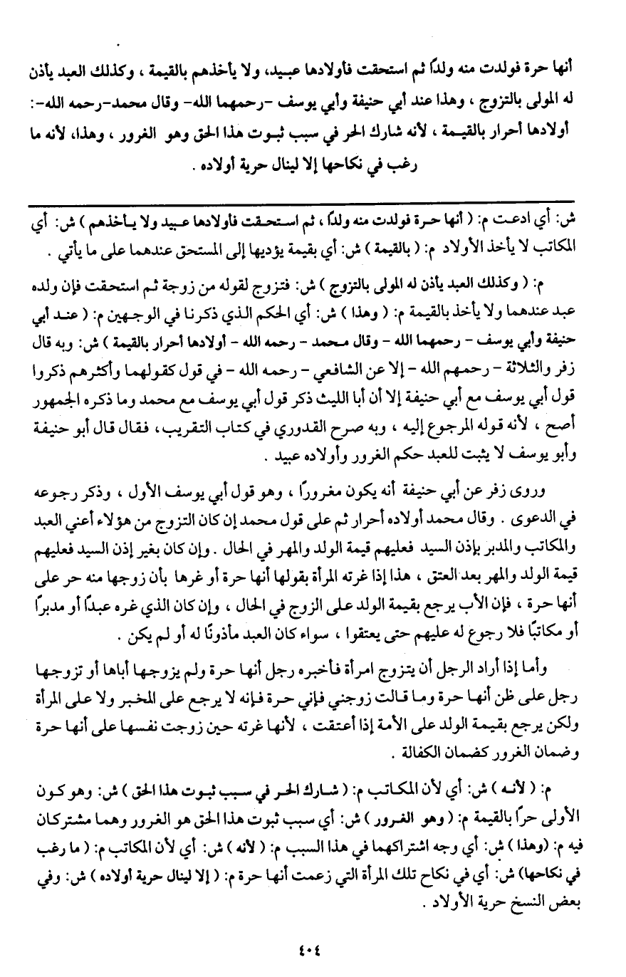 أنها حرة فولدت منه ولدا ثم استحقت فأولادها عبيد، ولا يأخذهم بالقيمة، وكذلك العبد يأذن له المولى بالتزوج، وهذا عند أبي حنيفة وأبي يوسف - رحمهما الله - وقال محمد - رَحِمَهُ اللَّهُ -: أولادها أحرار بالقيمة؛ لأنه شارك الحر في سبب ثبوت هذا الحق وهو الغرور، وهذا لأنه ما رغب في نكاحها إلا لينال حرية أولاده.