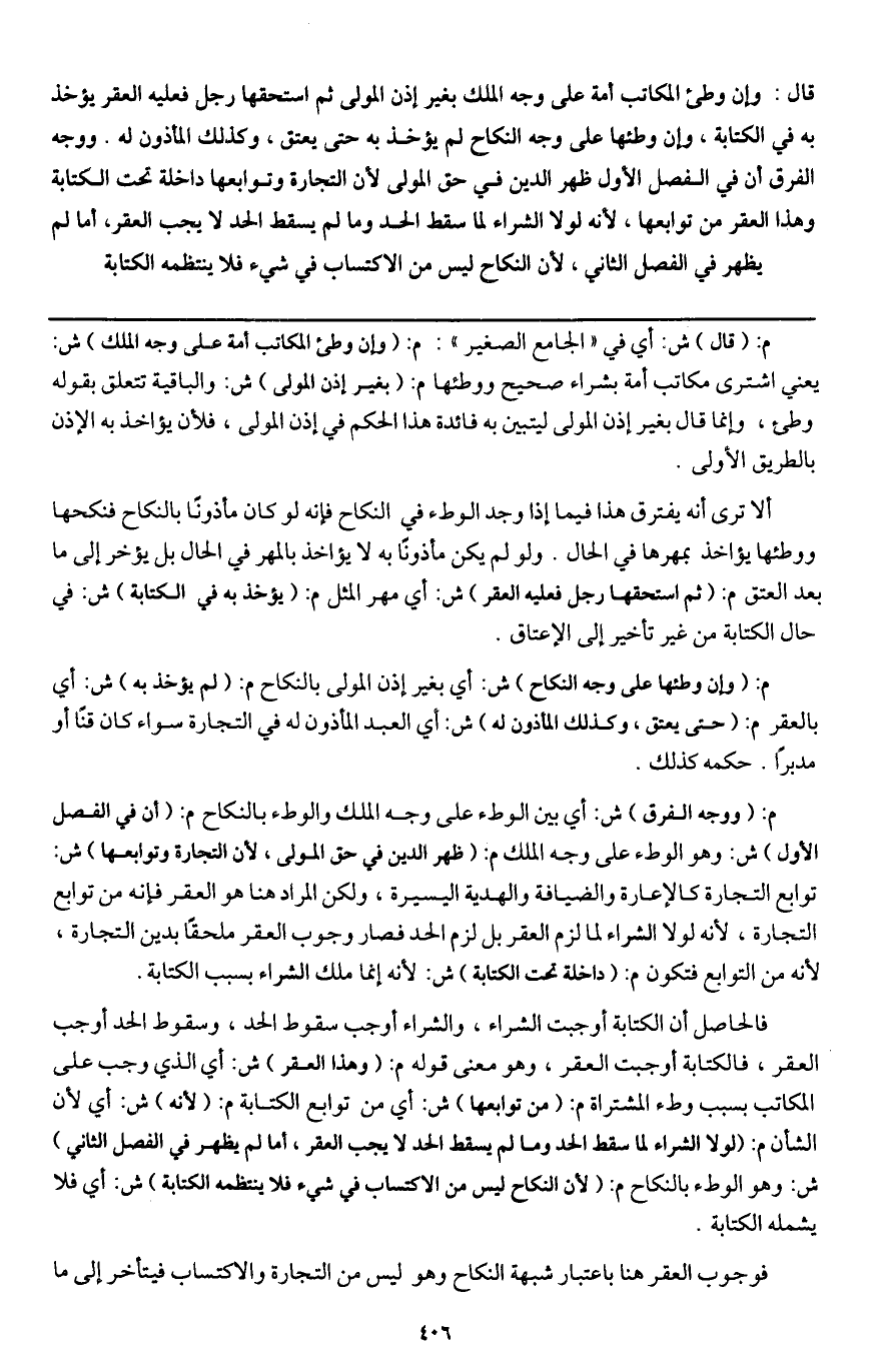 قال: وإن وطئ المكاتب أمة على وجه الملك بغير إذن المولى ثم استحقها رجل فعليه العقر يؤخذ به في الكتابة، وإن وطئها على وجه النكاح لم يؤخذ به حتى يعتق، وكذلك المأذون له. ووجه الفرق أن في الفصل الأول ظهر الدين في حق المولى لأن التجارة وتوابعها داخلة تحت الكتابة وهذا العقر من توابعها؛ لأنه لولا الشراء لما سقط الحد وما لم يسقط الحد لا يجب العقر، أما لم يظهر في الفصل الثاني؛ لأن النكاح ليس من الاكتساب في شيء فلا ينتظمه الكتابة