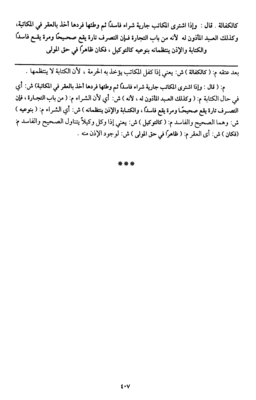 م: (قال: وإذا اشترى المكاتب جارية شراء فاسدا ثم وطئها فردها أخذ بالعقر في المكاتبة) ش: أي في حال الكتابة م: (وكذلك العبد المأذون له؛ لأنه) ش: أي لأن الشراء م: (باب التجارة، فإن التصرف تارة يقع صحيحا ومرة يقع فاسدا، والكتابة والإذن ينتظمانه) ش: أي الشراء م: (بنوعيه) ش: وهما الصحيح والفاسد م: (كالتوكيل) ش: يعني إذا وكل وكيلا يتناول الصحيح والفاسد م: (فكان) ش: أي العقر م: (ظاهرا في حق المولى) ش: لوجود الإذن منه.