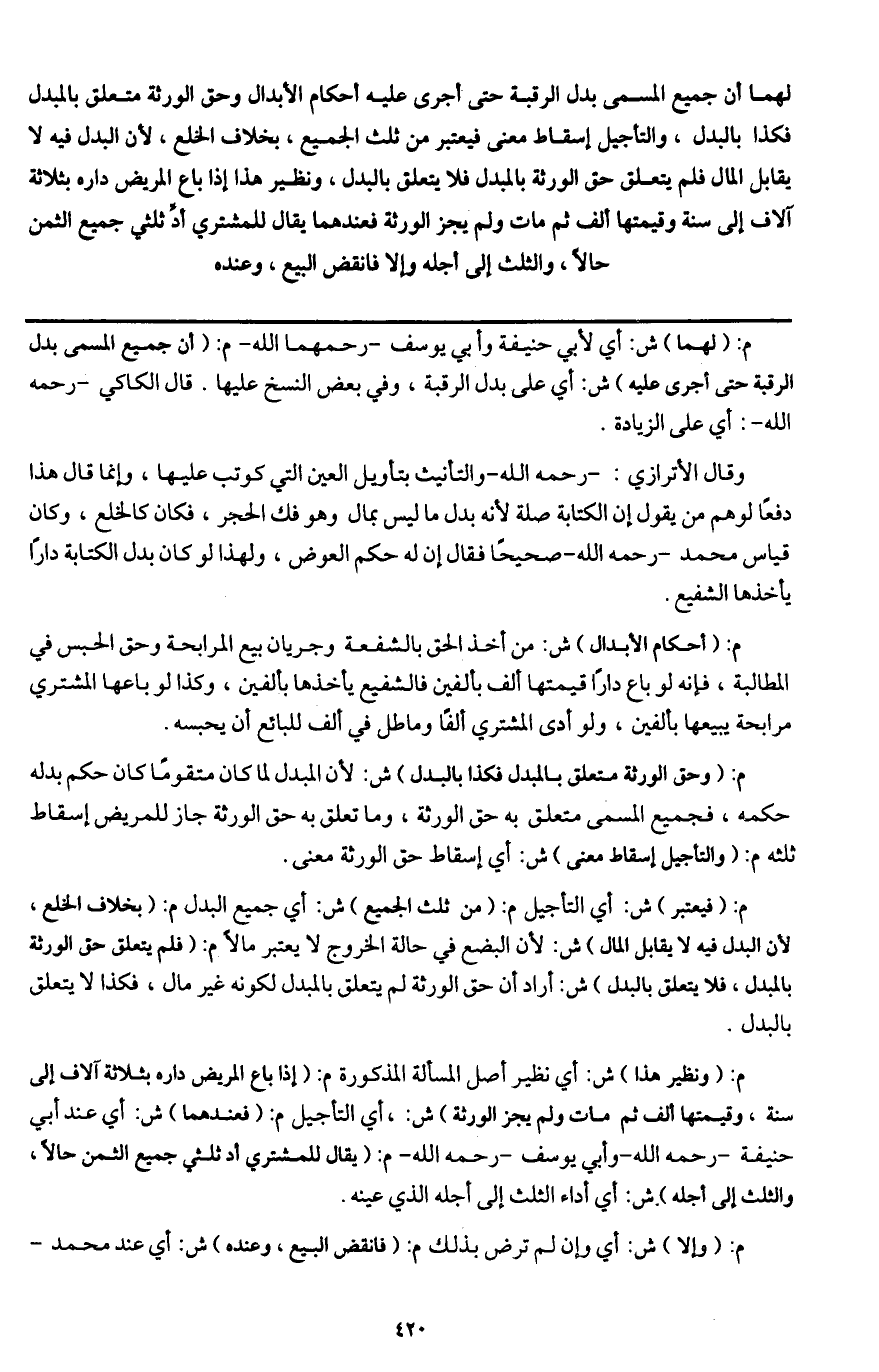 م: (أحكام الأبدال) ش: من أخذ الحق بالشفعة وجريان بيع المرابحة وحق الحبس في المطالبة، فإنه لو باع داراً قيمتها ألف بألفين فالشفيع يأخذها بألفين، وكذا لو باعها المشتري مرابحة يبيعها بألفين، ولو أدى المشتري ألفا وماطل في ألف للبائع أن يحبسه.