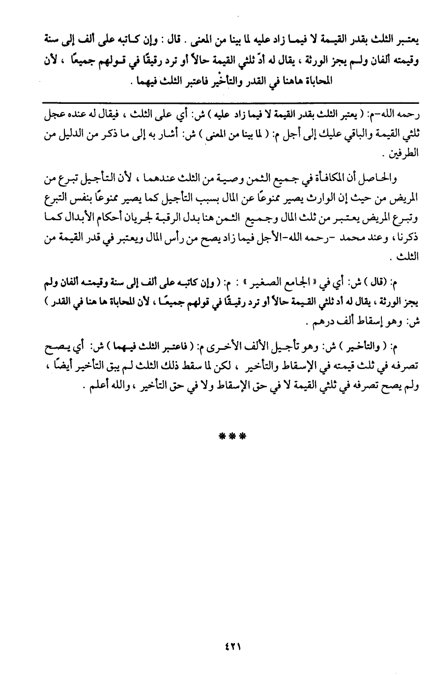 والحاصل أن المكافأة في جميع الثمن وصية من الثلث عندهما؛ لأن التأجيل تبرع من المريض من حيث إن الوارث يصير ممنوعاً عن المال بسبب التأجيل كما يصير ممنوعا بنفس التبرع وتبرع المريض يعتبر من ثلث المال وجميع الثمن هنا بدل الرقبة لجريان أحكام الأبدال كما ذكرنا، وعند محمد - رَحِمَهُ اللَّهُ - الأجل فيما زاد يصح من رأس المال ويعتبر في قدر القيمة من الثلث.