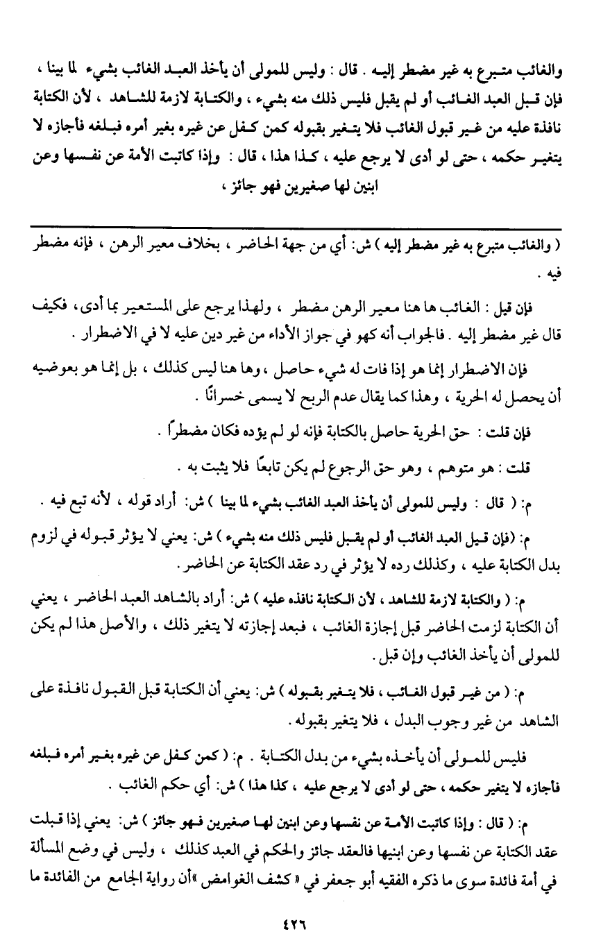 والغائب متبرع به غير مضطر إليه. قال: وليس للمولى أن يأخذ العبد الغائب بشيء لما بينا، فإن قبل العبد الغائب أو لم يقبل فليس ذلك منه بشيء، والكتابة لازمة للشاهد؛ لأن الكتابة نافذة عليه من غير قبول الغائب فلا يتغير بقبوله كمن كفل عن غيره بغير أمره فبلغه فأجازه لا يتغير حكمه، حتى لو أدى لا يرجع عليه، كذا هذا،