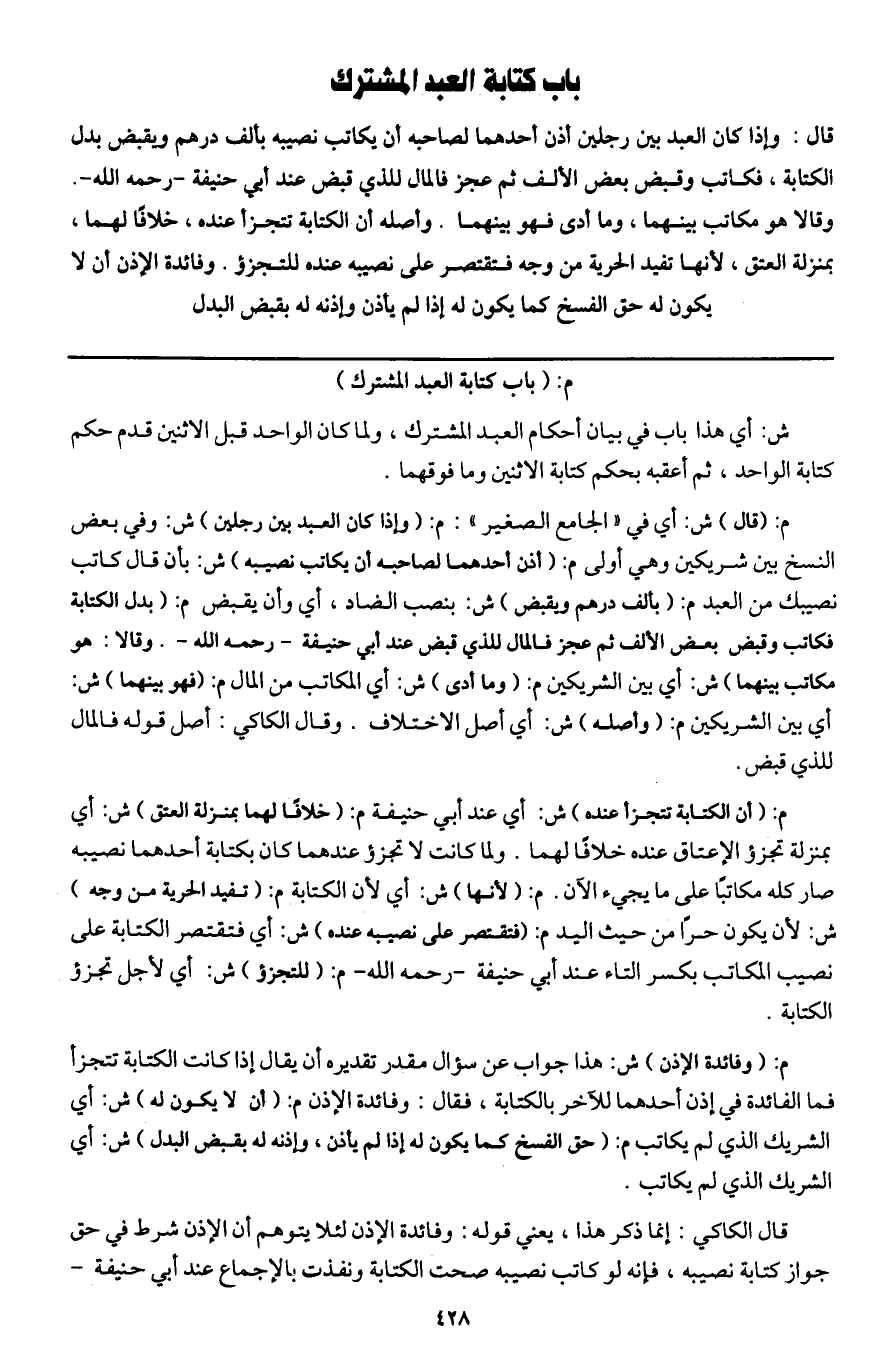 م: (باب كتابة العبد المشترك) ش: أي هذا باب في بيان أحكام العبد المشترك، ولما كان الواحد قبل الاثنين قدم حكم كتابة الواحد، ثم أعقبه بحكم كتابة الاثنين وما فوقهما. م: (قال) ش: أي في " الجامع الصغير ": م: (وإذا كان العبد بين رجلين) ش: وفي بعض النسخ بين شريكين وهي أولى م: (أذن أحدهما لصاحبه أن يكاتب نصيبه) ش: بأن قال كاتب نصيبك من العبد م: (بألف درهم ويقبض) ش: بنصب الضاد، أي وأن يقبض م: (بدل الكتابة فكاتب وقبض بعض الألف ثم عجز فالمال للذي قبض عند أبي حنيفة - رَحِمَهُ اللَّهُ -. وقالا: هو مكاتب بينهما) ش: أي بين الشريكين م: (وما أدى) ش: أي المكاتب من المال م: (فهو بينهما) ش: أي بين الشريكين م: (وأصله) ش: أي أصل الاختلاف. وقال الكاكي: أصل قوله فالمال للذي قبض.