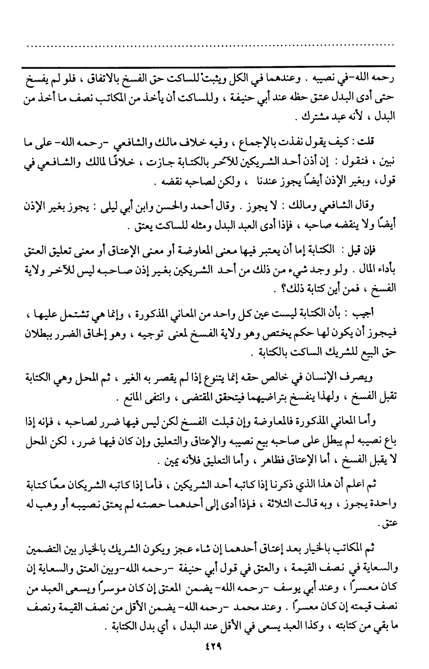 ـــــــــــــــــــــــــــــQ- رَحِمَهُ اللَّهُ - في نصيبه. وعندهما في الكل ويثبت للساكت حق الفسخ بالاتفاق، فلو لم يفسخ حتى أدى البدل عتق حظه عند أبي حنيفة، وللساكت أن يأخذ من المكاتب نصف ما أخذ من البدل؛ لأنه عبد مشترك.