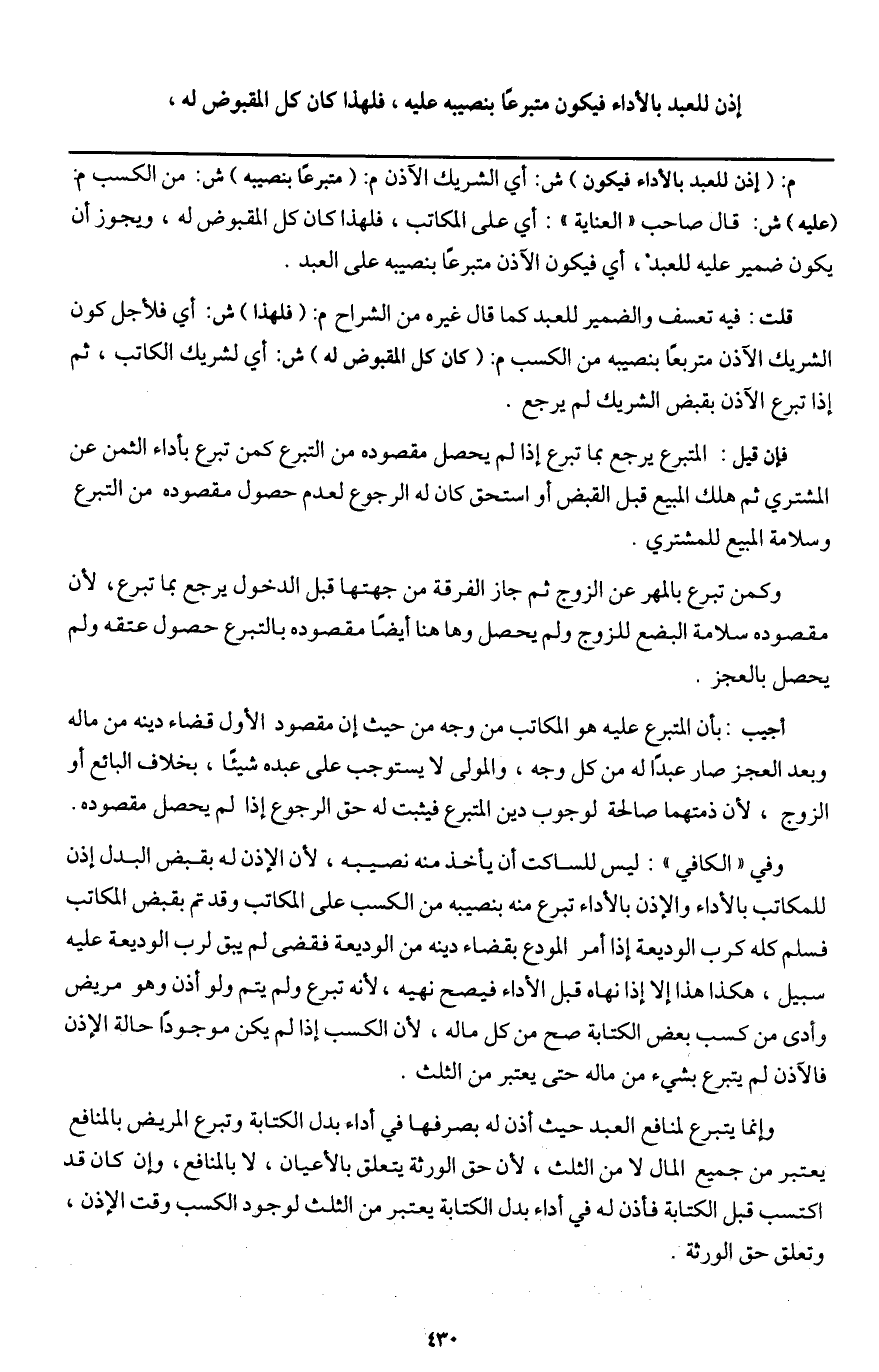 ـــــــــــــــــــــــــــــQم: (إذن للعبد بالأداء فيكون) ش: أي الشريك الآذن م: متبرعا بنصيبه ش: من الكسب م: (عليه) ش: قال صاحب العناية: أي على المكاتب، فلهذا كان كل المقبوض له، ويجوز أن يكون ضمير عليه للعبد، أي فيكون الآذن متبرعا بنصيبه على العبد.