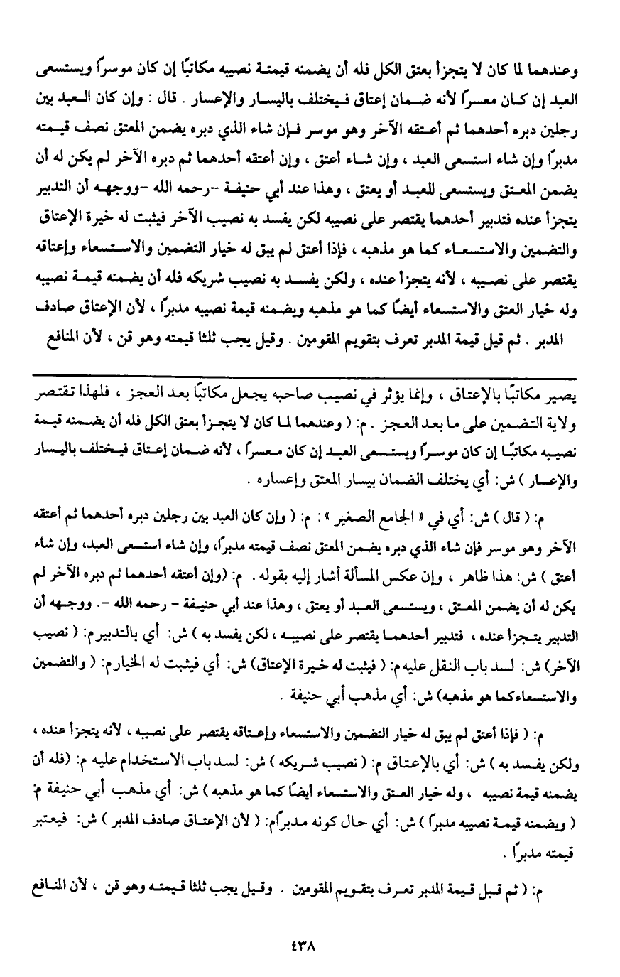 وعندهما لما كان لا يتجزأ بعتق الكل فله أن يضمنه قيمة نصيبه مكاتبا إن كان موسرا ويستسعى العبد إن كان معسرا لأنه ضمان إعتاق فيختلف باليسار والإعسار. قال: وإن كان العبد بين رجلين دبره أحدهما ثم أعتقه الآخر وهو موسر فإن شاء الذي دبره يضمن المعتق نصف قيمته مدبرا، وإن شاء استسعى العبد وإن شاء أعتق وإن أعتقه أحدهما ثم دبره الآخر لم يكن له أن يضمن المعتق ويستسعى للعبد أو يعتق، وهذا عند أبي حنيفة - رَحِمَهُ اللَّهُ - ووجهه أن التدبير يتجزأ عنده فتدبير أحدهما يقتصر على نصيبه لكن يفسد به نصيب الآخر فيثبت له خيرة الإعتاق والتضمين والاستسعاء كما هو مذهبه، فإذا أعتق لم يبق له خيار التضمين والاستسعاء وإعتاقه يقتصر على نصيبه؛ لأنه يتجزأ عنده ولكن يفسد به نصيب شريكه فله أن يضمنه قيمة نصيبه وله خيار العتق والاستسعاء أيضا كما هو مذهبه ويضمنه قيمة نصيبه مدبرا؛ لأن الإعتاق صادف المدبر. ثم قيل قيمة المدبر تعرف بتقويم المقومين وقيل يجب ثلثا قيمته وهو قن لأن المنافع