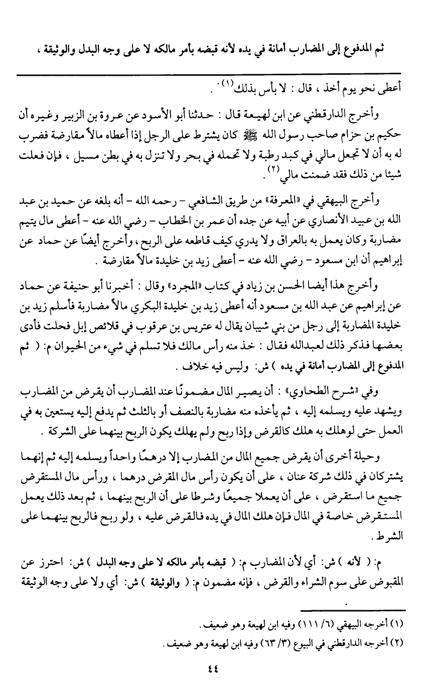 وأخرج البيهقي في " المعرفة " من طريق الشافعي - رَحِمَهُ اللَّهُ - أنه بلغه عن حميد بن عبد الله بن عبيد الأنصاري عن أبيه عن جده أن عمر بن الخطاب - رَضِيَ اللَّهُ عَنْهُ - أعطى مال يتيم مضاربة وكان يعمل به بالعراق ولا يدري كيف قاطعه على الربح، وأخرج أيضاً عن حماد عن إبراهيم أن ابن مسعود - رَضِيَ اللَّهُ عَنْهُ - أعطى زيد بن خليدة مالاً مقارضة.
